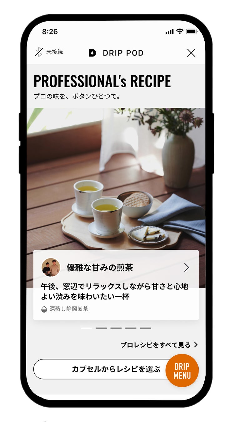 コーヒーはもちろん、お茶の味わいにもこだわっており、2020年のカプセルリニューアル(※1)の際には、専用カプセル「深蒸し静岡煎茶」の茶葉の再選定から味覚設計を行ったほか、より茶葉の甘さやうまみを引き出せるよう、同年に発売したマシン「DP3」のお茶の抽出プログラムも見直しを行いました。今回、新たに「DRIP POD YOUBI」の「プロレシピ」機能を活用することで、茶葉から抽出まで監修いただいている茶師(※2)が引き出した新たなお茶の味わいを楽しむことができます。