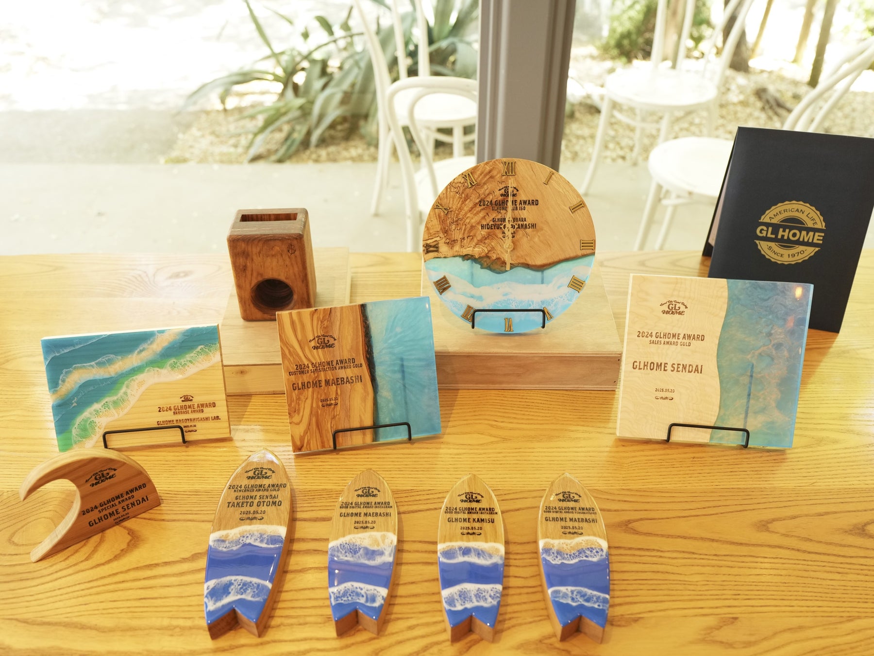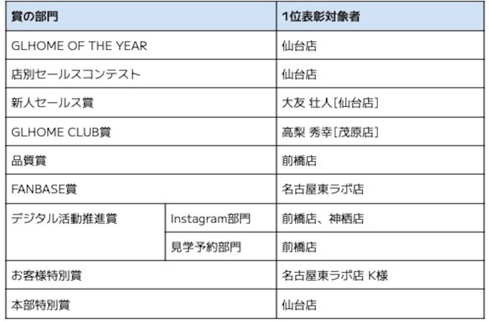 表彰式では、冒頭にジーエルホームカンパニーのプレジデントの西浜将児より、受賞者へのお祝いの言葉とともに、GLホームが55周年を迎えたこと、今後の方向性について話がありました。表彰式では、昨年に引き続き、表彰者の読み上げを本部GLホーム担当スタッフが行い、加盟店と本部スタッフ全員でその成果を称え合いました。最高賞である「GLHOME OF THE YEAR」グランプリには、GLホーム仙台店が受賞しました。また、仙台店は、短期・新人・店別のセールスコンテストも受賞し活躍が目立ちました。なお、2024年度の各種コンテストの受賞者・受賞店は次頁の通りです。