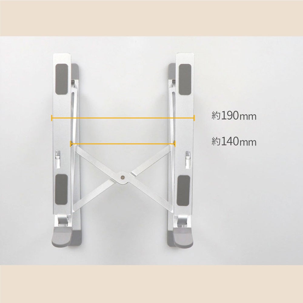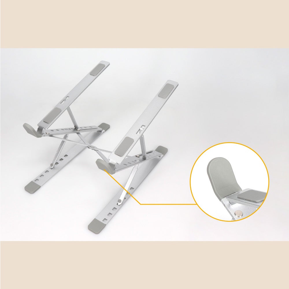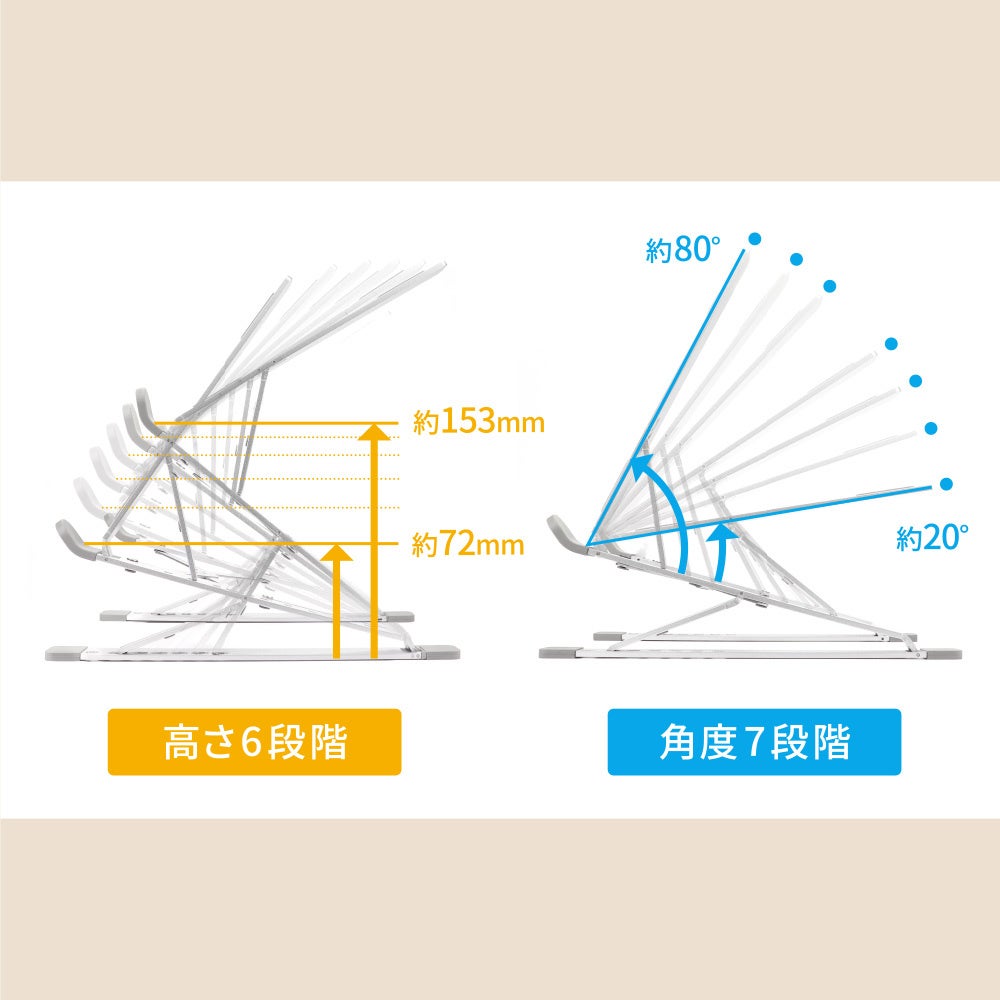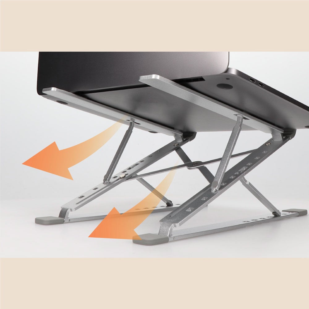 本製品は高さや角度を調整できる、折りたたみ式のアルミスタンドです。高さは6段階、角度は7段階の調節が可能です。使用する機器に目線を合わせることで、正しい姿勢で作業ができ、身体への負担が軽減します。