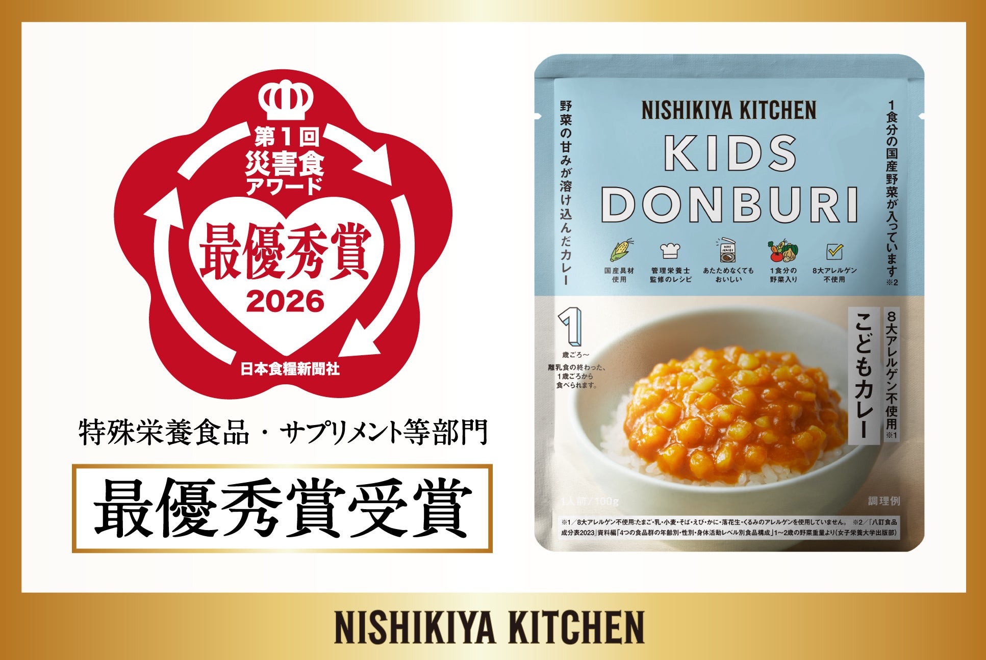 「世界の料理を『カンタン』に。」をコンセプトに掲げ、レトルトカレーを中心に約120種類のレトルト食品を販売する専門店NISHIKIYA KITCHEN(ニシキヤキッチン)(株式会社にしき食品 本社:宮城県岩沼市、代表取締役社長:菊池洋一)は、日本食糧新聞社主催の「第1回災害食アワード2026」において、発売12年目のロングセラー商品「こどもカレー」が特殊栄養食品・サプリメント等部門で、最優秀賞を初受賞しました。「こどもカレー」はニシキヤキッチンが大切にする「おいしく防災」の考えのもと、離乳食の終わった1歳ごろからお召し上がりいただける商品で、「こどもが食べるものこそ、安心安全でおいしいものを」という想いと、仕事や家事、育児と忙しい日々を過ごすご家族の助けとなる商品をつくりたいという想いから2014年に誕生しました。管理栄養士監修のもと1食につき5種類以上の国産野菜を使い、温めても温めなくてもおいしくお召し上がりいただける味わいに仕上げており、普段の「時短ごはん」にはもちろん、いざという時の「備え(ローリングストック)」にも長く愛され続けています。災害時の不安な気持ちに寄り添うのは、食べ慣れた「いつものおいしさ」です。東日本大震災から15年の節目に、被災企業として「おいしく防災」のメッセージを多くの方へ発信してまいります。