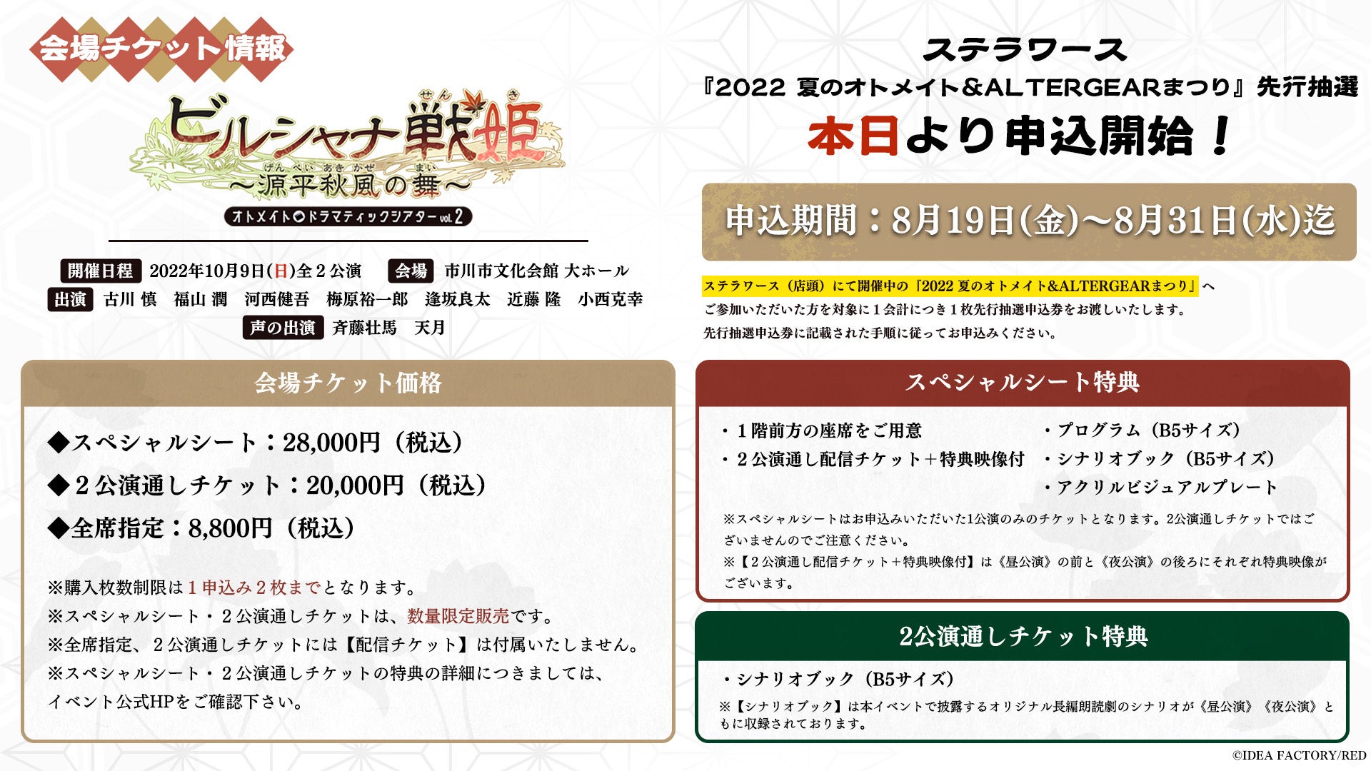 また本日より配信チケット販売、そして【ステラワース『2022 夏のオトメイト&ALTERGEARまつり』先行抽選】の会場チケット申込みが開始となりますのでお知らせ致します。