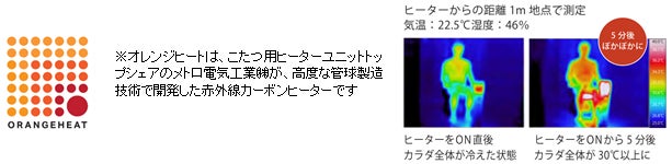 スイッチを入れた瞬間に暖かいと感じる速暖性と、まるで焚き火にあたっているかの様に身体の芯まで暖まる遠赤外線効果に優れたメトロ電気工業製「オレンジヒート」(※)を搭載。さらに本体を約11度傾ける事で、小さくても広い範囲を暖める斜塔デザインを採用しました。(意匠登録出願中:意願2022-14003)