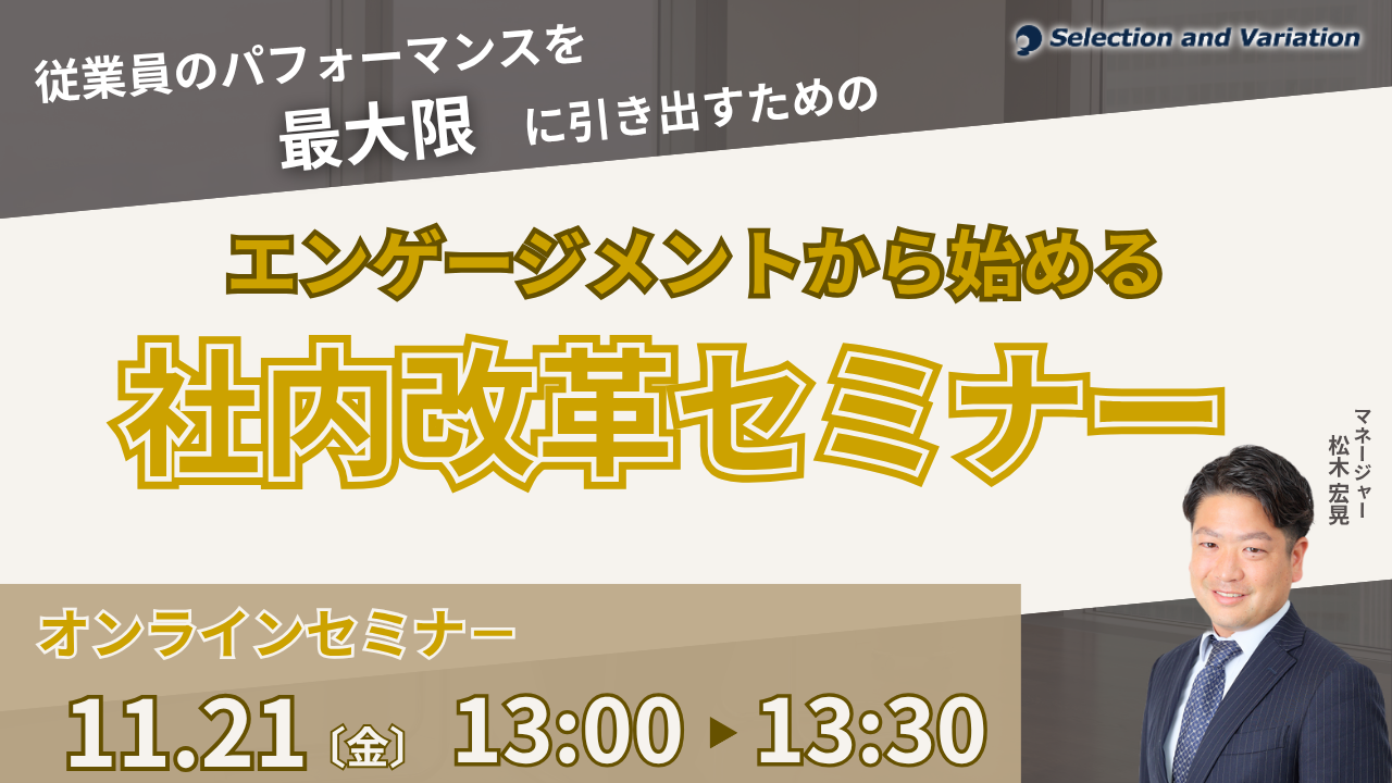 組織・人事コンサルティングファームであるセレクションアンドバリエーション株式会社(以下、当社、東京都千代田区丸の内、大阪市西区、名古屋市西区 / 代表取締役社長:平康慶浩/ URL:https://sele-vari.co.jp/ )は『従業員のパフォーマンスを最大限に引き出すための 「エンゲージメントから始める社内改革セミナー」』セミナーを2025年11月21日(金)13:00〜13:30に開催することをお知らせいたします。