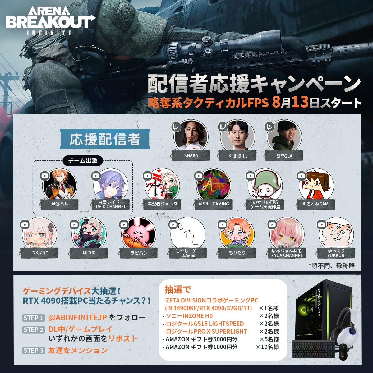 早期アクセス開始を記念して、公式X(Twitter)「@ABInfiniteJP」では、RTX4090搭載PCやゲームデバイス、Amazonギフト券などの豪華賞品が当たる配信者応援キャンペーンを開催中です。
