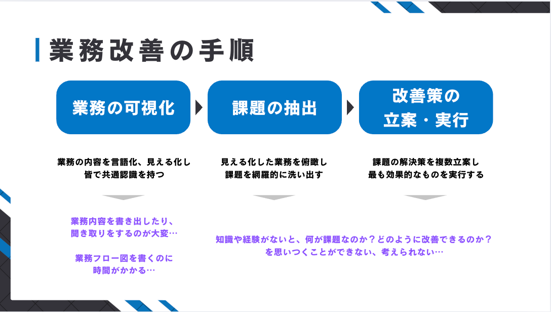 ・業務プロセスの可視化:一連の業務を把握後、生成AIが全体像を可視化