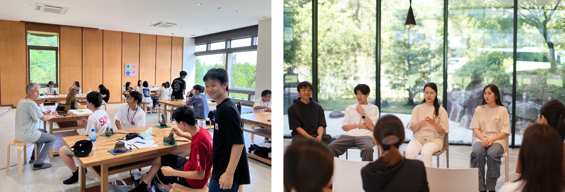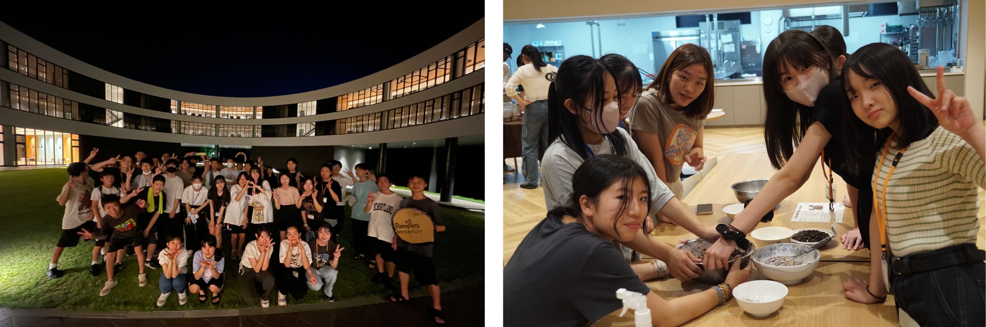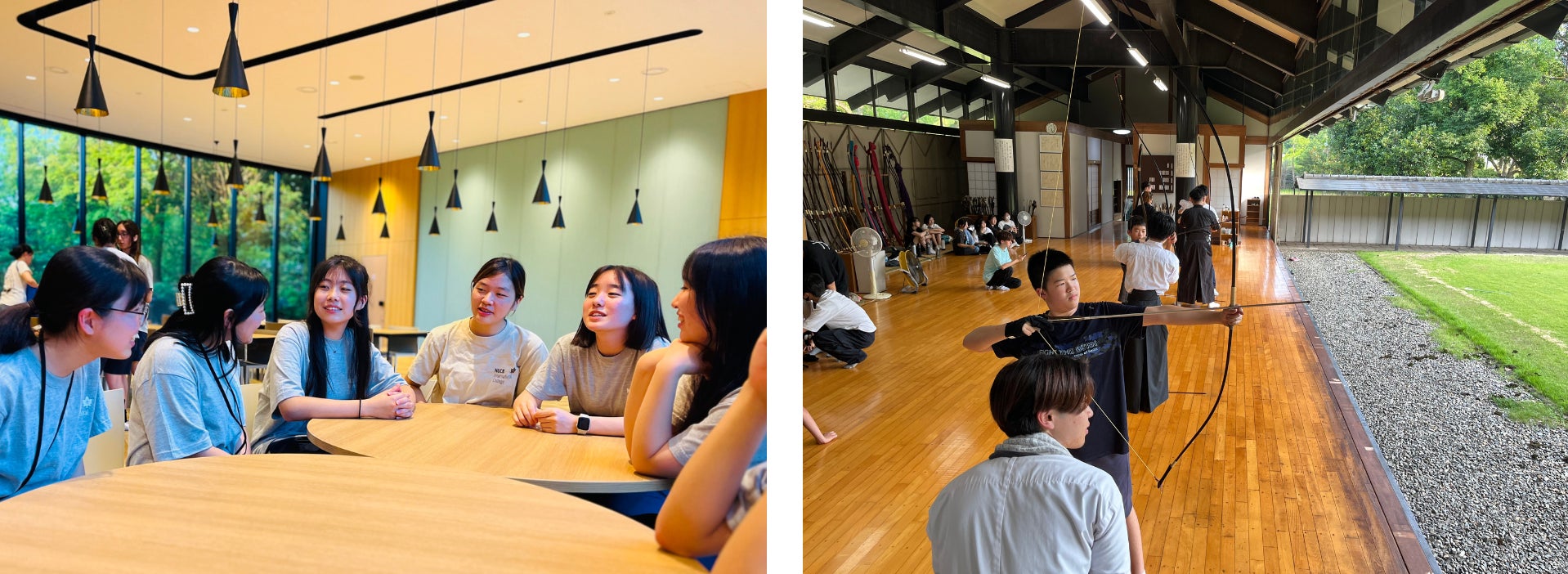また、全寮制の国際高等学校の特徴である寮での生活を通して、自立心と自己管理能力を身につけられるよう、授業が終わってから就寝時間まで、在校生は参加者と一緒に過ごし、生活面での支援も行いました。国際高等学校のサマースクールでは、課外活動として、弓道や生花といった日本の文化体験をはじめ、在校生のみで準備・運営されるナイト・アクティビティ、英語で対話・議論するスキルを学ぶ英語塾など、中学生が幅広い経験をする機会が提供され、在校生が各プログラムで教員のアシスタント役を担い、普段の学校生活で培ってきた国際的な視野と語学力、リーダーシップやコミュニケーション能力を発揮しました。