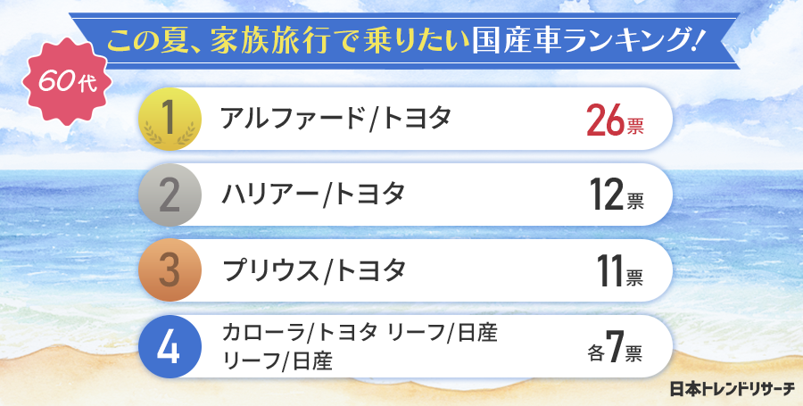 | 60代の男女が選ぶ「この夏、家族旅行で乗りたい国産車ランキング!」 |