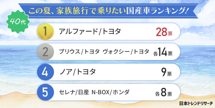 | 40代の男女が選ぶ「この夏、家族旅行で乗りたい国産車ランキング!」 |