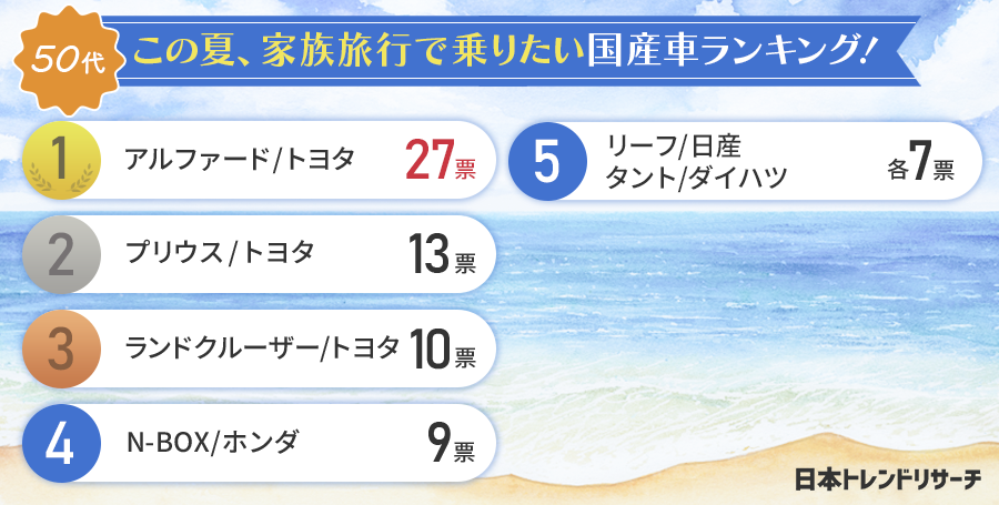 | 50代の男女が選ぶ「この夏、家族旅行で乗りたい国産車ランキング!」 |