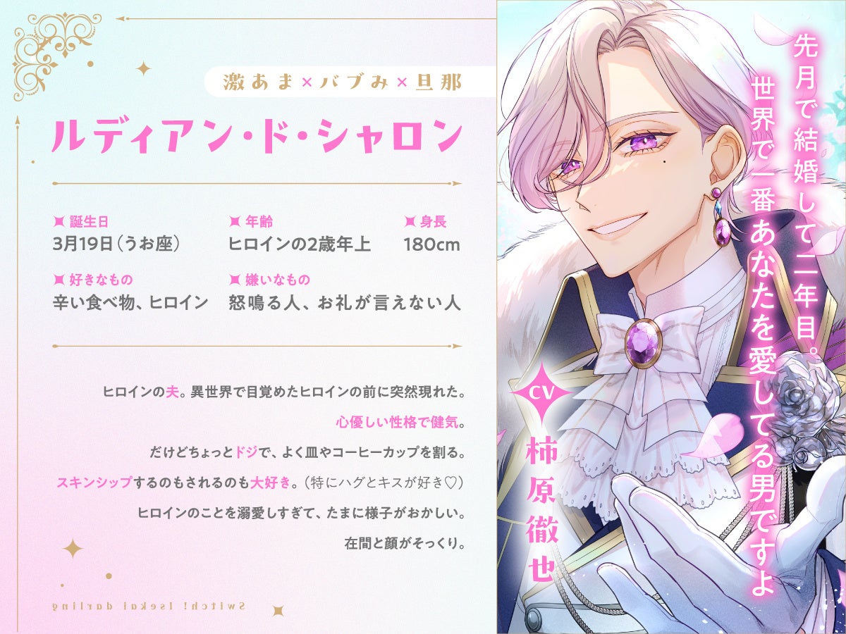 女性向け・乙女向けのボイス作品レーベル・GIRLSMANIAX(株式会社viviON、東京都千代田区、代表取締役:明石耕作)は、2024年4月4日(木)に、二次元コンテンツのダウンロード販売サービス「DLsite」において、全編無料のボイスドラマ『すいっち!異世界ダーリン ~バブみ旦那とモラハラ同期が同じ顔とか勘弁してください~』の配信を開始いたします。