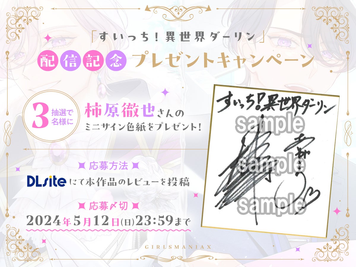 「DLsite」において本作のレビューを投稿していただいた方の中から、抽選で3名様に柿原徹也さんのミニサイン色紙をプレゼントします!