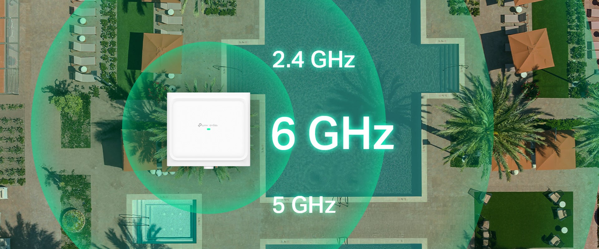 トライバンドWi-Fi(6GHz・5GHz・2.4GHz)で300㎡(推奨カバレッジ)の広範囲を全方位にカバーし、スムーズな屋外Wi-Fiネットワークを提供します。