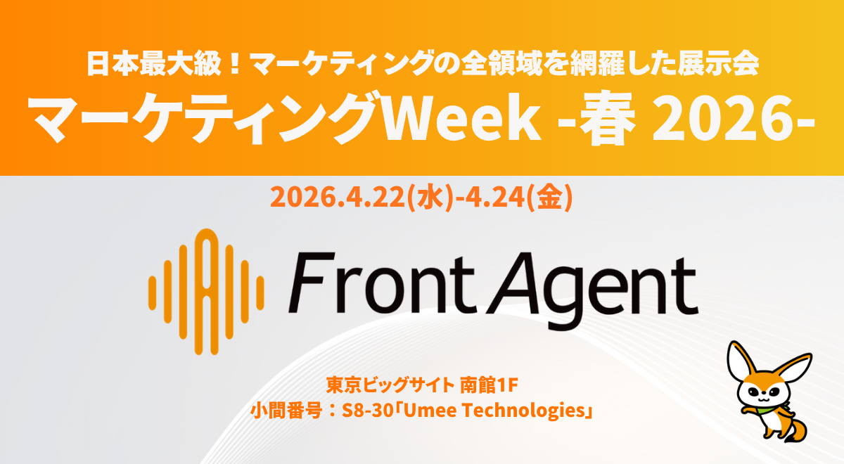 商談ビッグデータが勝ち筋に導くインサイトアナリシス™「Front Agent」を開発・提供するUmee Technologies株式会社(本社:東京都調布市、代表取締役:新納 弘崇、以下「ユミー」)は、2026年4月22日(水)から24日(金)まで東京ビッグサイトで開催される「第26回 マーケティングWeek -春 2026-」内の『マーケティング戦略立案Expo』に出展いたします。