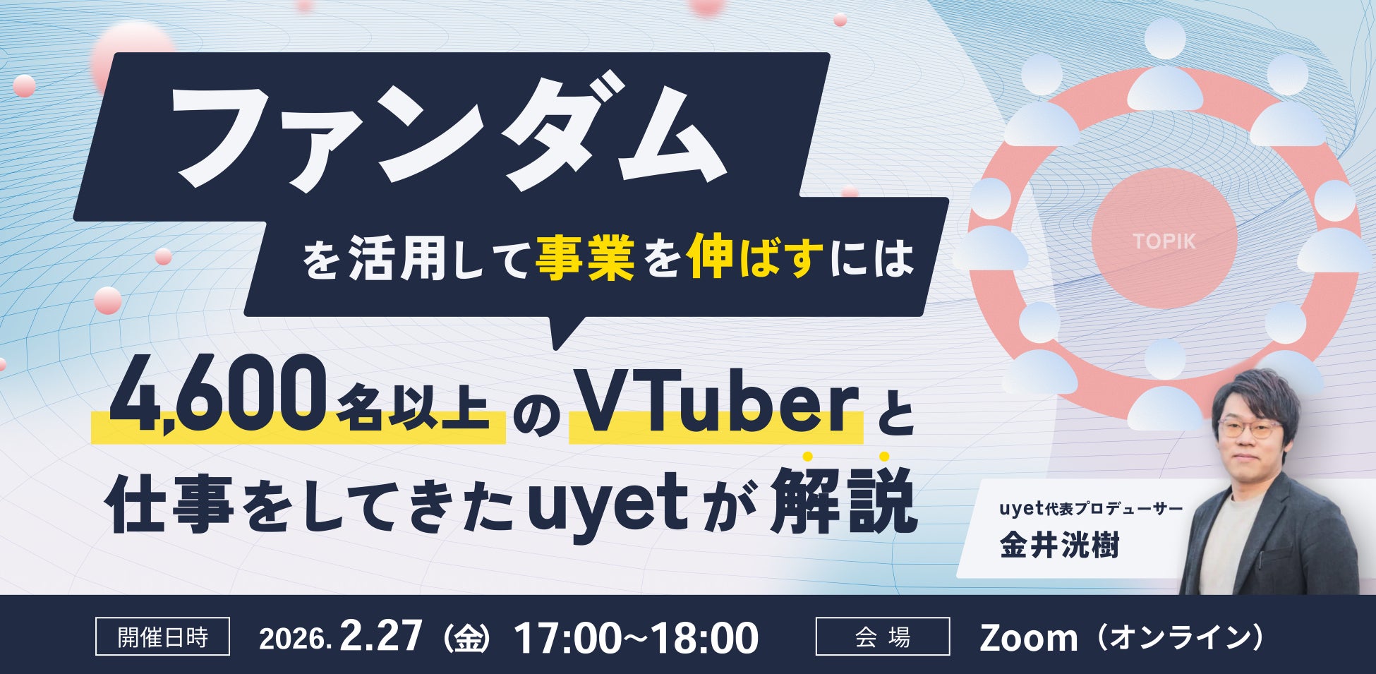 VTuber、IPコンテンツを通して日本と世界で新たな流通を生み出す“IPコンテンツの総合商社”株式会社uyet(ユエット)(本社:東京都渋谷区、代表取締役:梶田大樹)は、2月27日(金)17時から「VTuberマーケティングにおいてのファンダムを活用して事業を伸ばす方法」について解説するウェビナーを開催します。