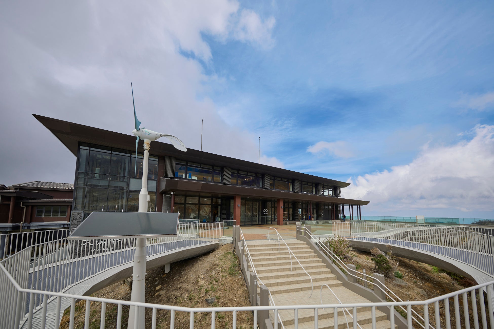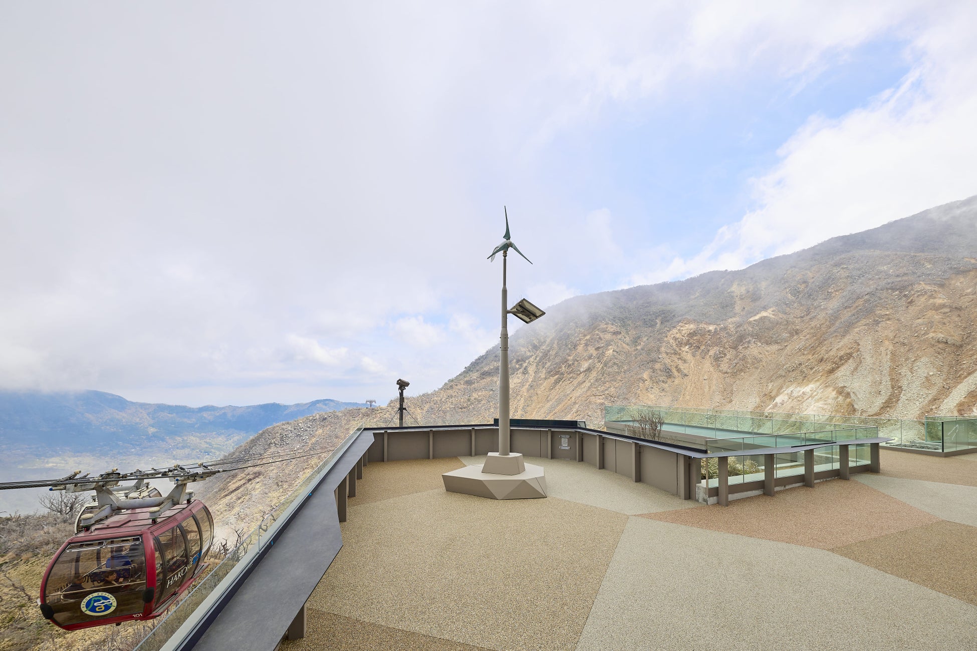 風力発電機や火山カメラの周囲にスタンディングカウンターを設け、ショップで購入した軽飲食とともに、大涌谷の景色を眺めることができます。ロープウェイに最も近づいた写真が撮れる絶好のスポットです。天気の良い日は、広がる大地や相模湾、東京都心のビル群を遠望できて、心地よい開放感を味わえます。