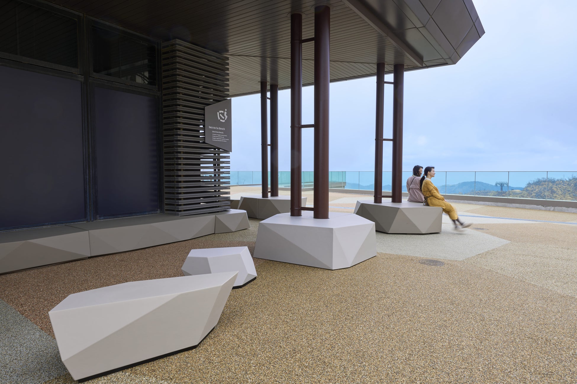 駅を出てすぐ目の前に広がる荒々しい大涌谷の岩肌と連続性のあるデザインのベンチです。自然との一体感を味わい、周囲の景色とともにくつろげるスペースです。