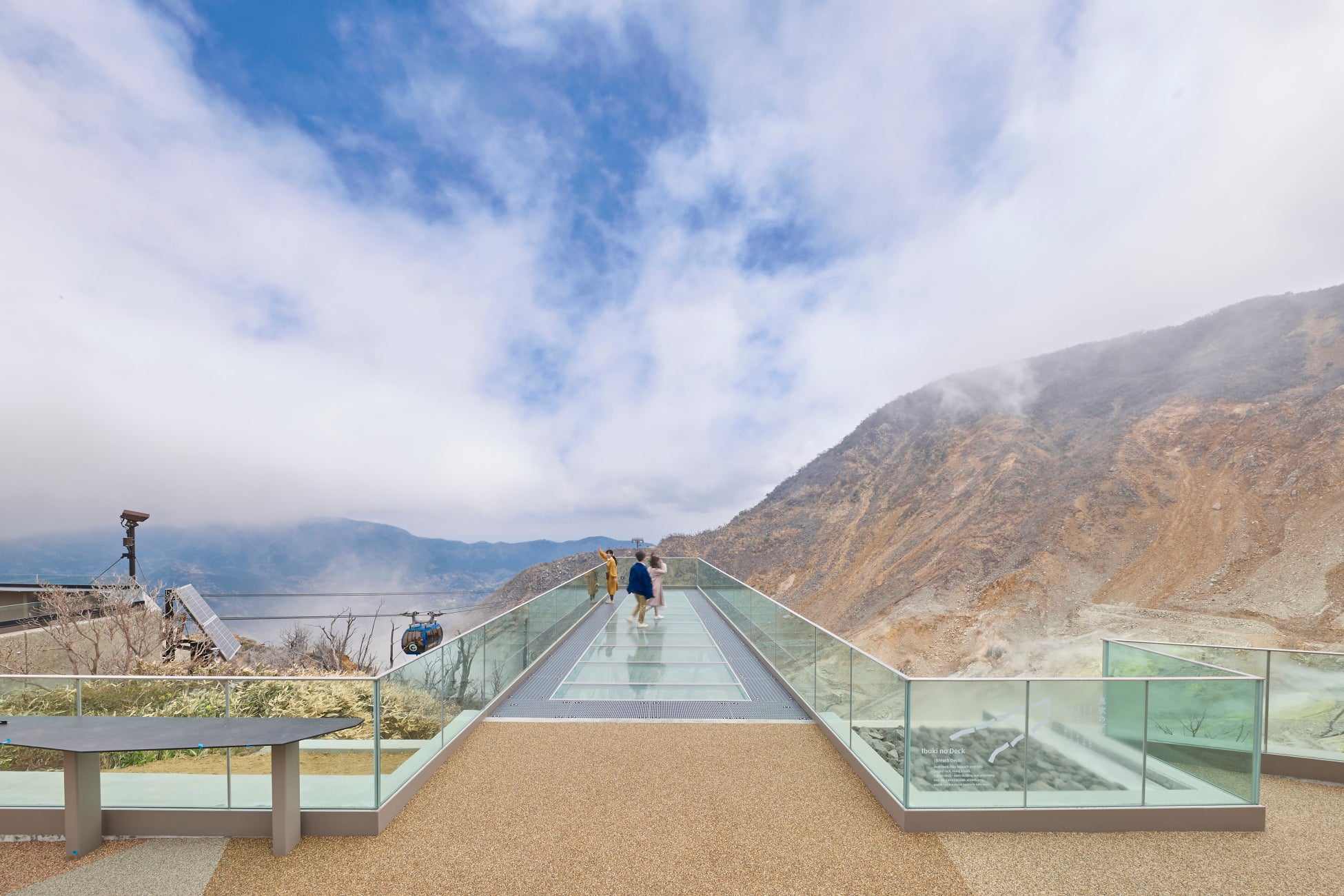谷の上へ約11メートル突き出す高さ約8メートルのデッキはガラス張りでスリル満点です。足元から真下に広がる大涌谷の蒸気立ち上る眺めは圧巻で、大地の息吹を感じられます。壮大な自然の絶景がもつ神秘的な雰囲気とともに噴気のにおいや視界の変化など、様々な大涌谷に出会える場所です。また、蒸気立ち上る大涌谷の真上をロープウェイが通り過ぎる様子をご覧いただけます。