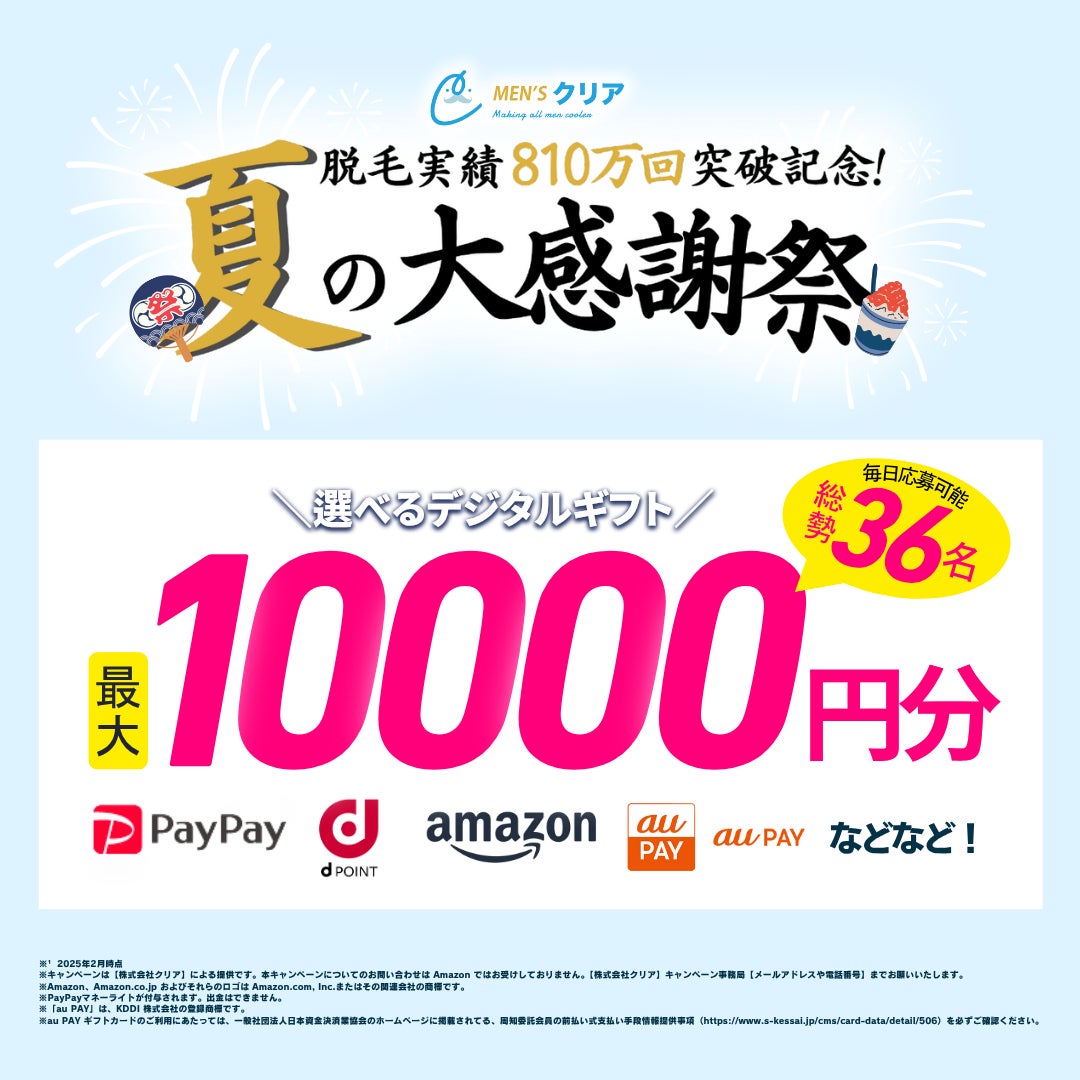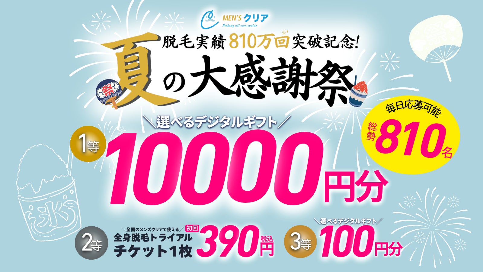 『選べるデジタルギフト最大10,000円分』や『全身脱毛トライアル初回390円(税込)チケット』が総勢810名に当たる。2025年の夏もメンズクリアの『X』公式アカウントで盛り上がろう!