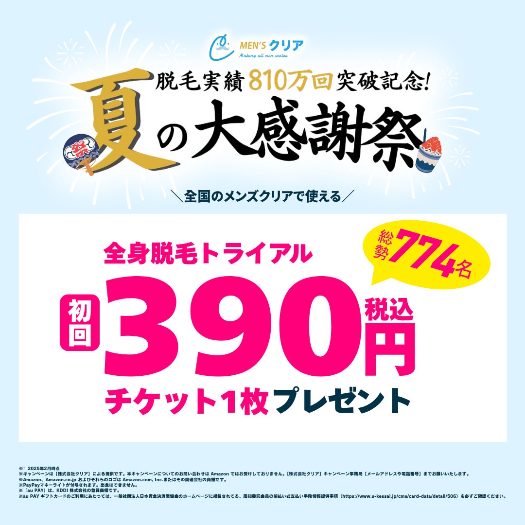 株式会社クリア(本社:東京都渋谷区、代表取締役社長:勝沼 潤)が運営するメンズ脱毛サロン「メンズクリア」は、累計脱毛施術回数が810万回*¹を突破いたしました。 これを記念して、2025年8月6日(水)より、X(旧Twitter)公式アカウントにて、総勢810名に当たる「メンズクリア 夏の大感謝祭」を開催いたします。