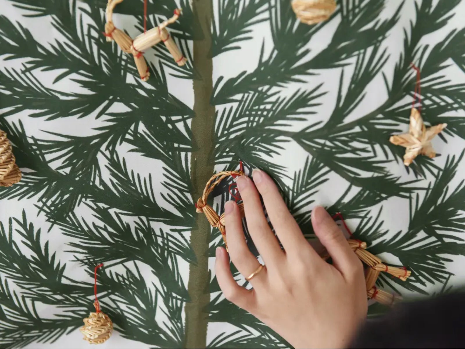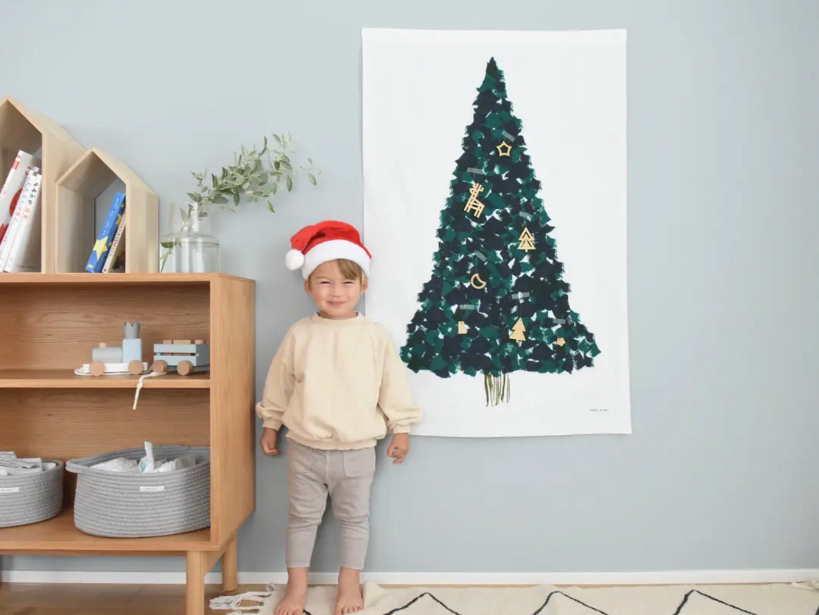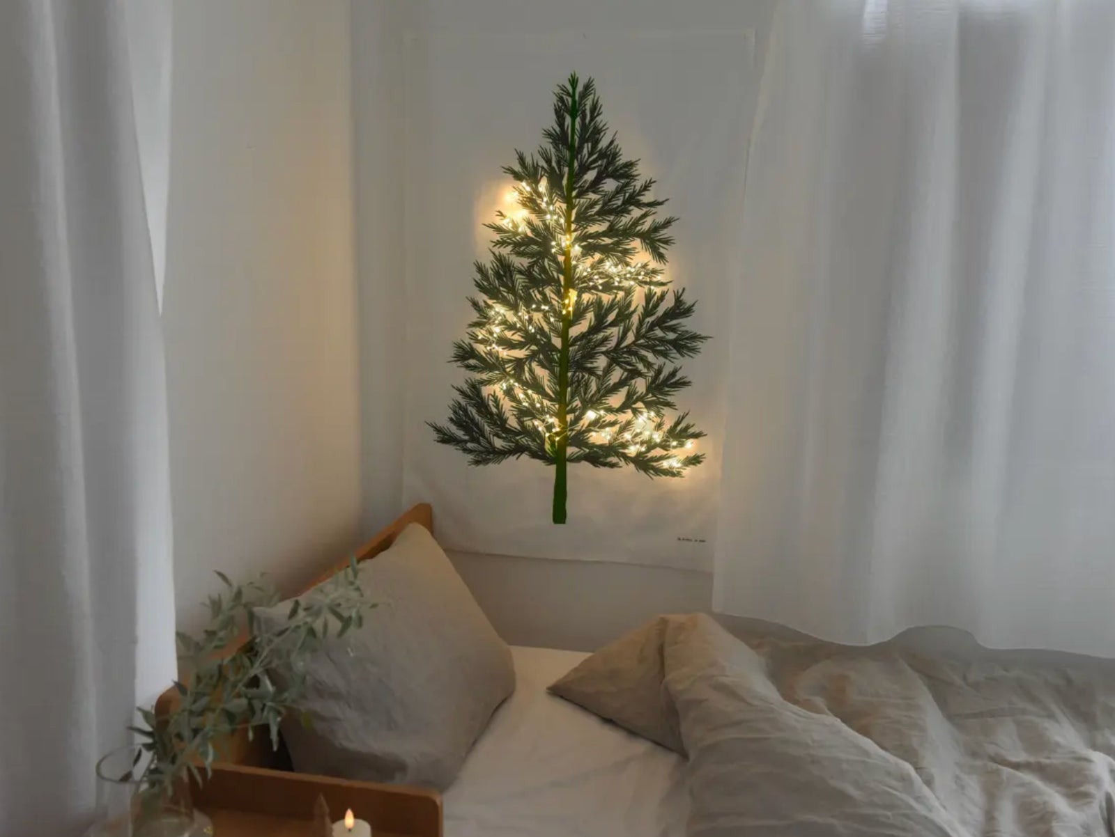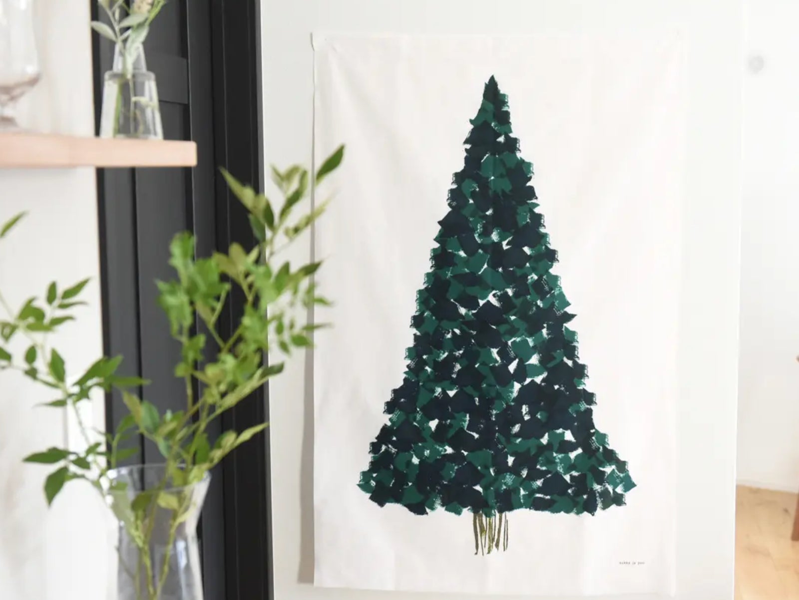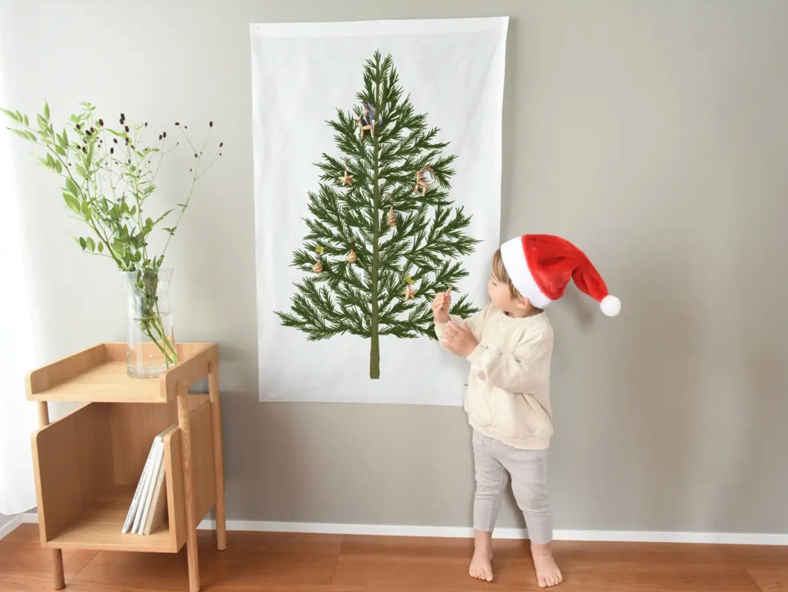 けれど飾り付けや後片付けが大変だし、時期が過ぎてからの保管も場所をとる。そんな懸念なく飾れるのが、壁に貼るタイプの「クリスマスツリータペストリー」です。
