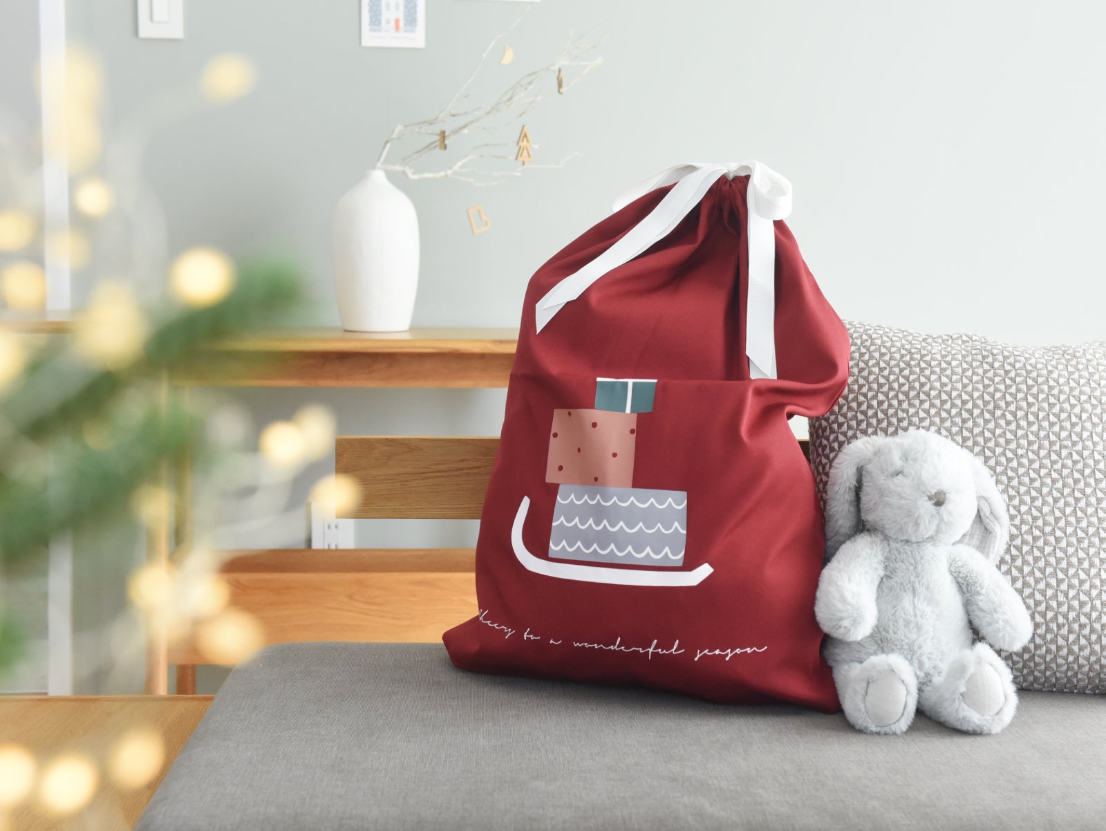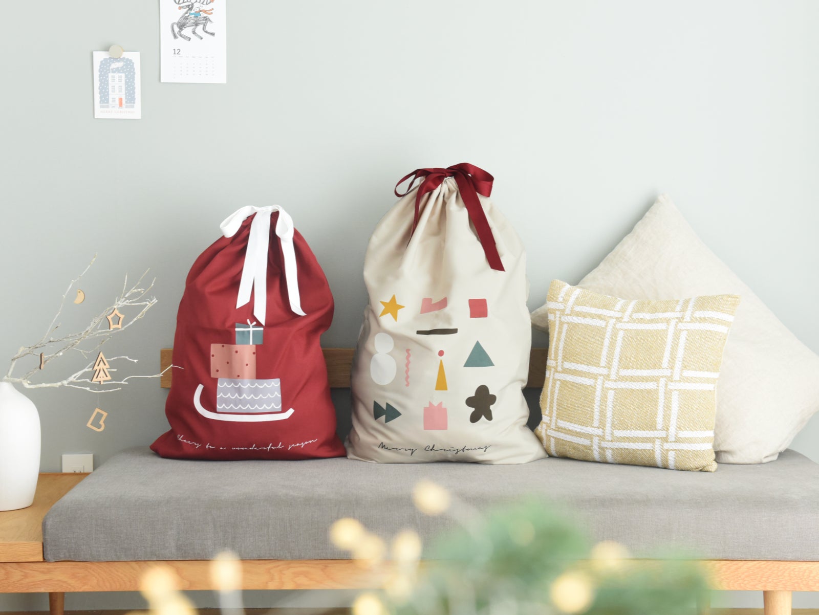 巾着袋はサンタさんのプレゼント袋をモチーフにデザイン。