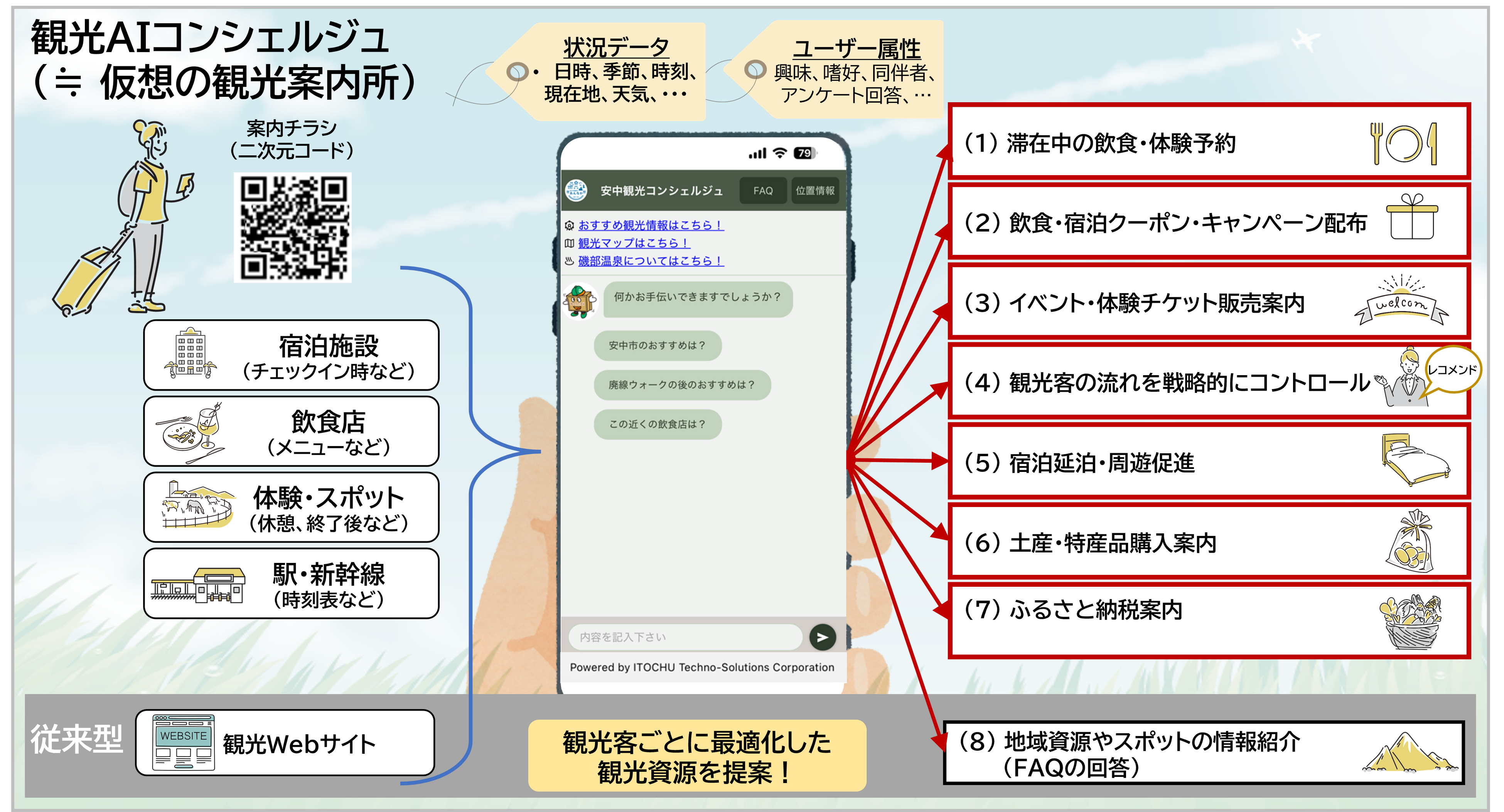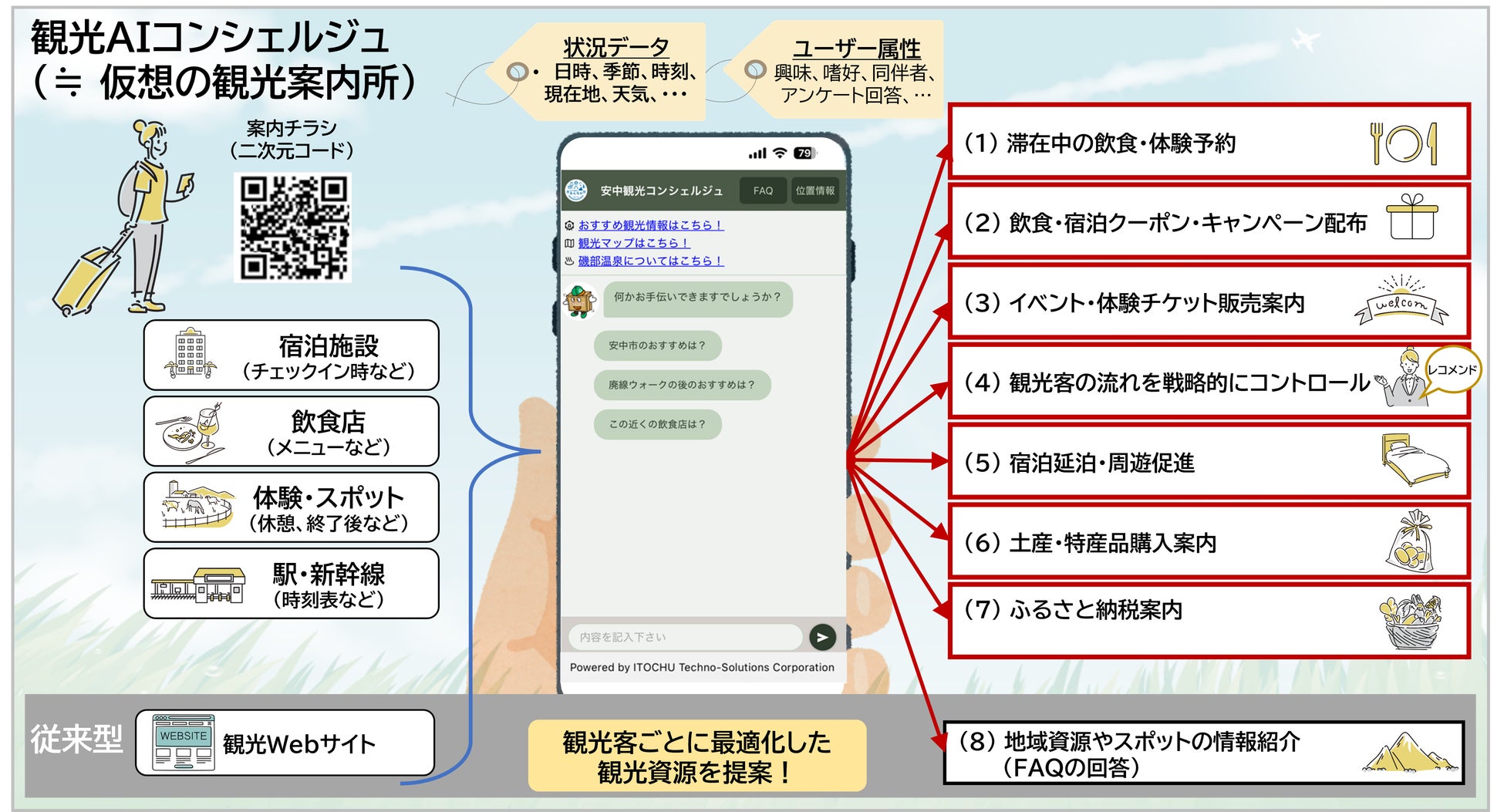 伊藤忠テクノソリューションズ株式会社(代表取締役社長:新宮 達史、本社:東京都港区、略称:CTC)と一般社団法人 安中市観光機構(理事長:武井 宏、所在地:群馬県安中市、以下:安中市DMO※1)は、一般社団法人 関東広域観光機構(代表理事:田川 博己、所在地:神奈川県横浜市、以下:関東広域DMO)と共に連携して、生成AIを活用した次世代観光案内サービス「観光AIコンシェルジュ」を開発し、1月よりサービス提供を開始しました。多言語かつ24時間対応で、旅行者一人ひとりに最適な提案を行い、安中市の地域観光の課題解決と消費拡大を支援します。