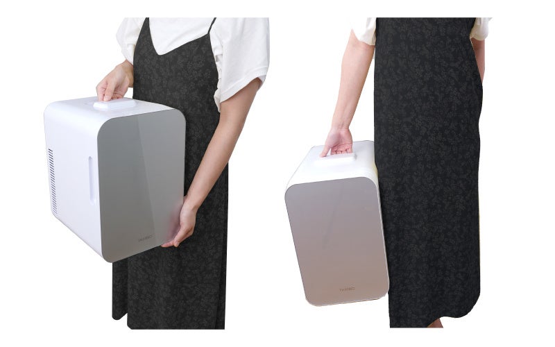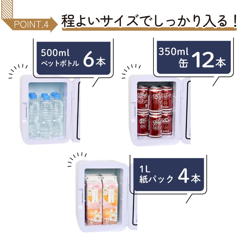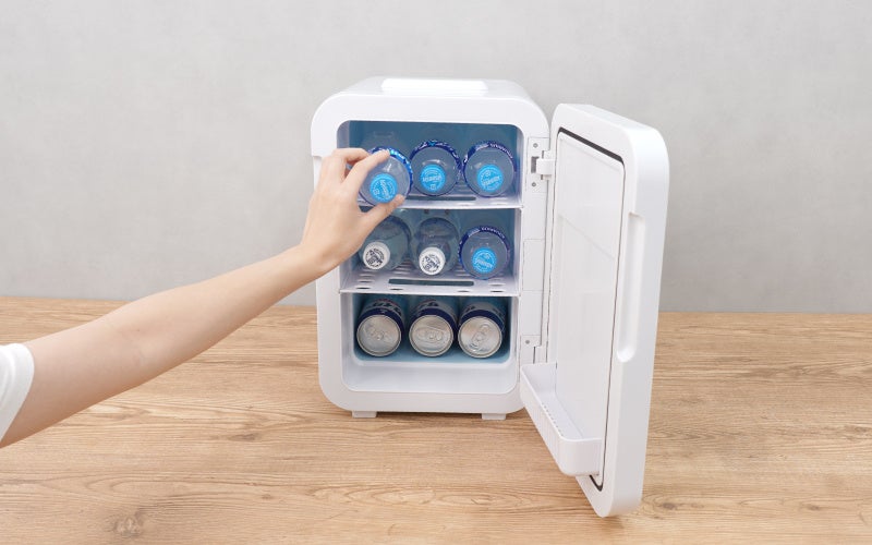 容量10Lサイズで350ml缶なら11本、500mlペットボトルなら4本、1L紙パックなら4本入れられます。背面スライドスイッチで保冷(約7度)と保温(約60度)を切り替えられます。寝室に置いても運転音が気になりづらいペルチェ冷却方式を採用。