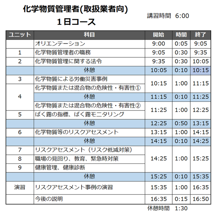 令和6年4月以降に化学物質管理者として選任される予定の方を対象に、必要な知識と実務能力を習得していただくため、学科6時間のカリキュラムによる講習です。