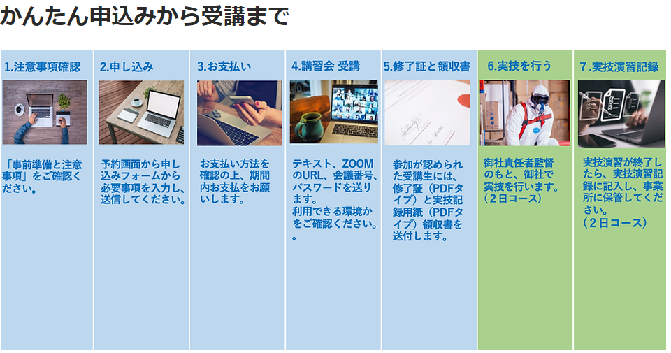 今までの講習は大都市などの中心部などの会場が多く、会場まで通うのに時間や交通費が無駄という方、大人数での会場は感染リスクで不安という方もかなり多いのも事実です。