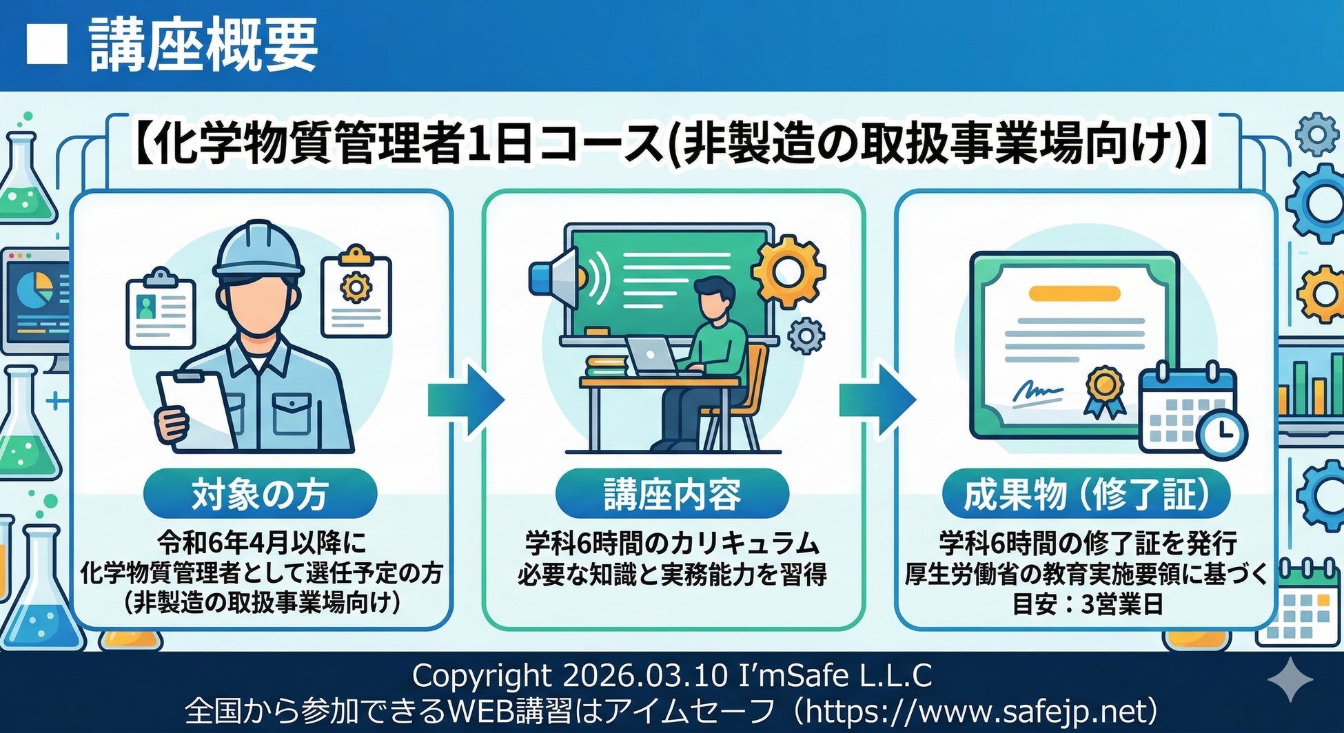 アイムセーフ合同会社では、厚生労働省通達による【化学物質管理者1日コース(非製造の取扱事業場向け)】を社内受講できる便利なオンライン講習会で実施しています。