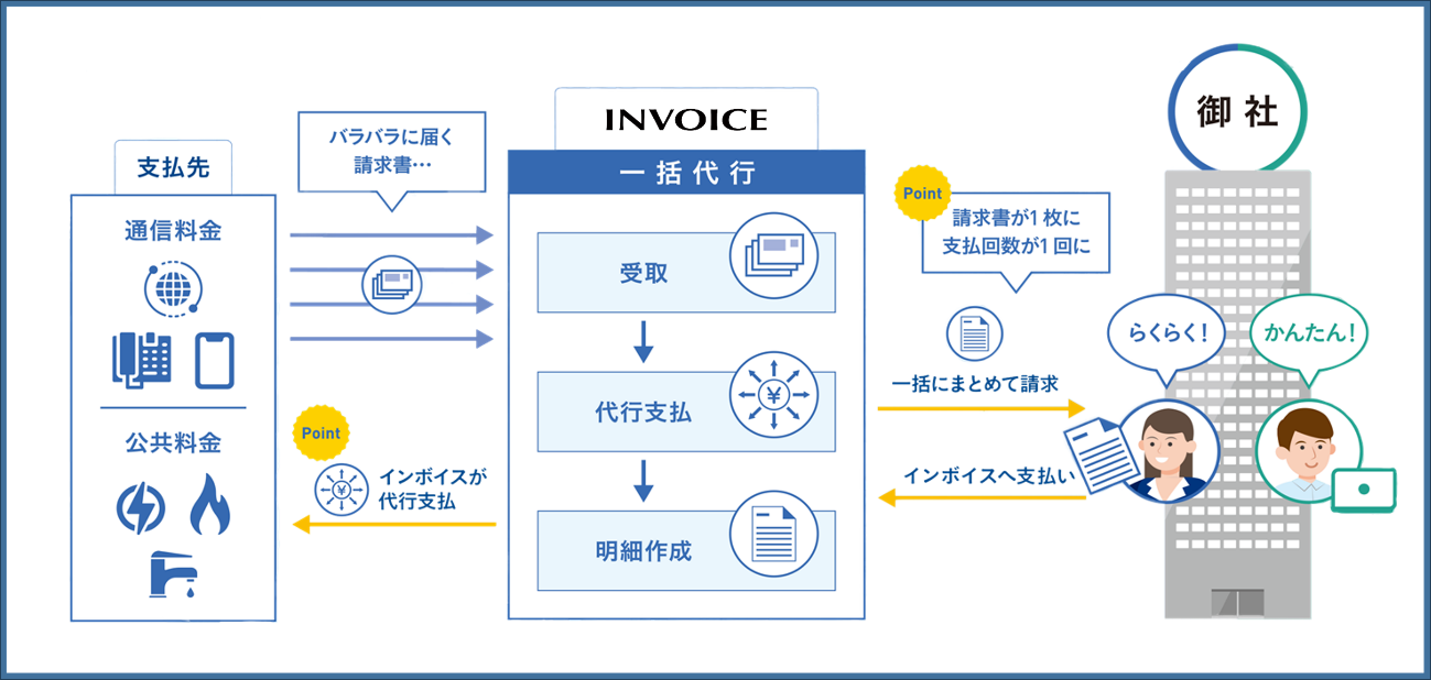 (株)インボイスでは、お客様に代わり請求書を受領し、通信キャリアやサプライヤーへの支払いを代行することで、お客様への請求書をおまとめし1本化する【一括請求サービス】を提供しています。