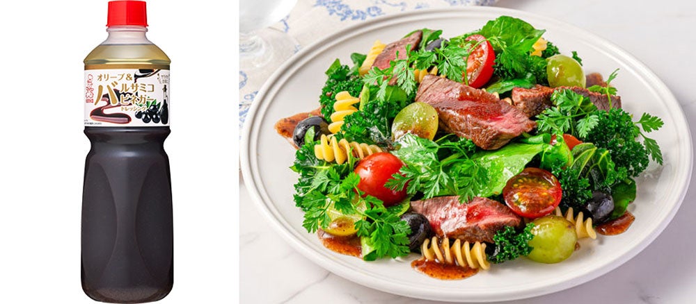 フルーティーなバルサミコ酢が、ローストビーフなどを使用したごちそう感あふれるサラダと相性抜群です。すりおろしオリーブと赤ワインを加え、コク深く贅沢な美味しさにこだわりました。