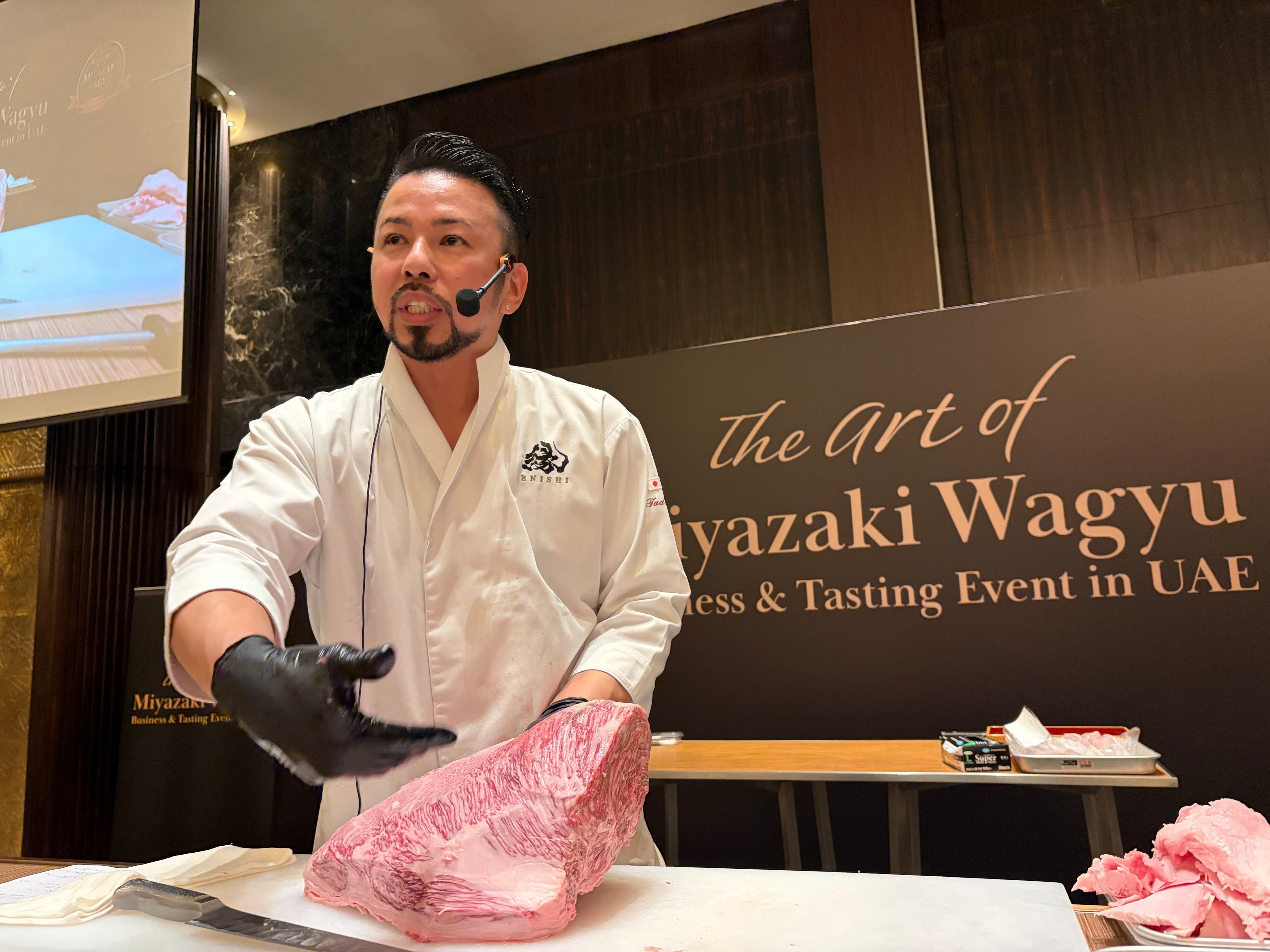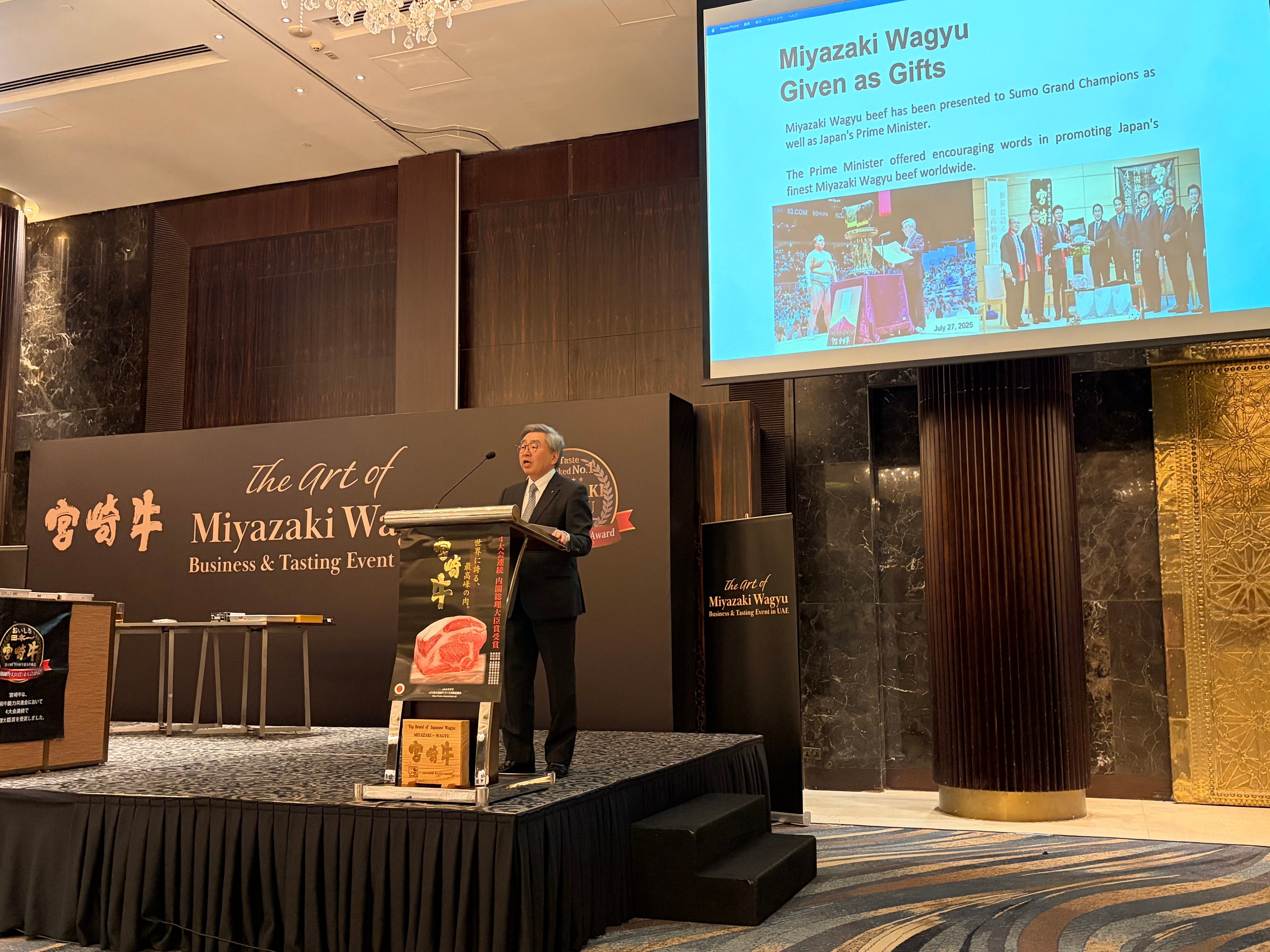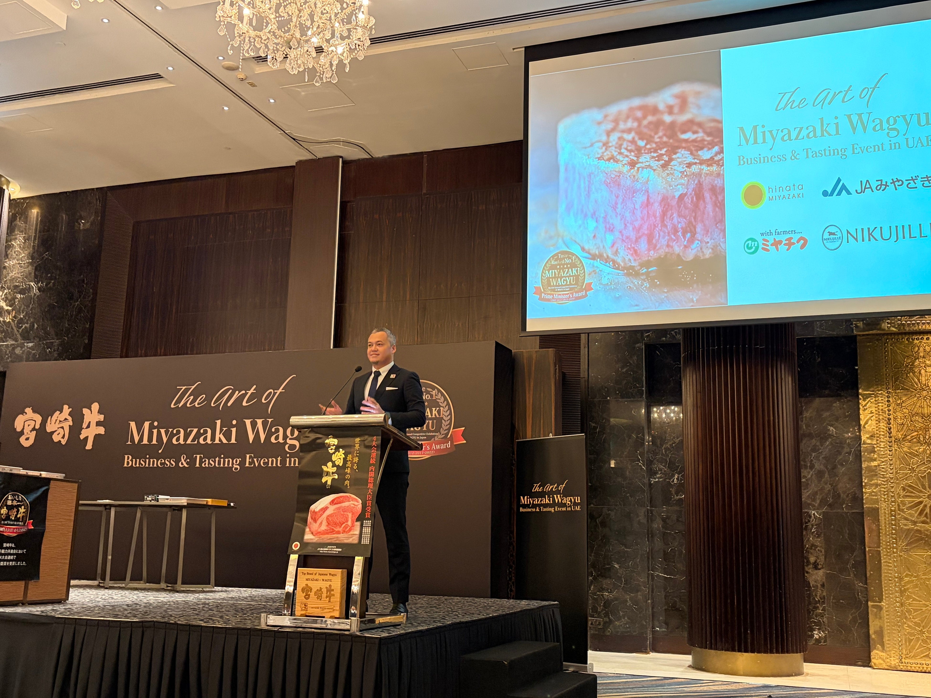 また、当日は在ドバイ日本国総領事館の今西総領事にも御出席いただき、「近年、中東における和牛の人気は確実に高まっている。(もうじき宮崎県でと畜した宮崎牛のUAE輸出が見込まれていると伺っているが)ここまでたどり着くまでには、生産者や関係者の皆様の大変な苦労があったと思う。今回のイベントを通してUAEの方々に、作り手の思いや哲学をしっかり理解いただき、宮崎牛の輸出拡大につながることを期待している。」とご挨拶いただきました。