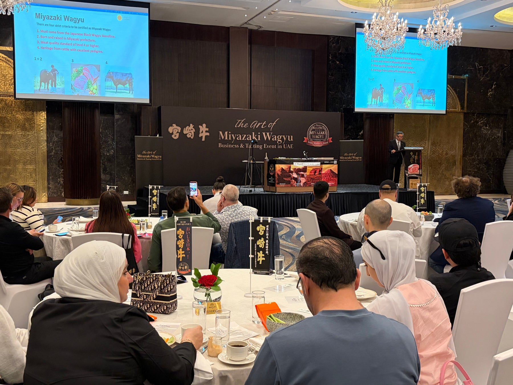 県産牛肉のイスラム圏における輸出拡大に向けて、県内で初めてハラール認証を取得した株式会社SEミート宮崎(以下、「SEミート」)からアラブ首長国連邦(UAE)向けの輸出解禁を見込み、宮崎県は、1月23日(現地時間)にドバイ市内の高級ホテルにおいて現地のバイヤーや飲食店関係者などを招へいした約100名規模の宮崎牛レセプションを開催しました。