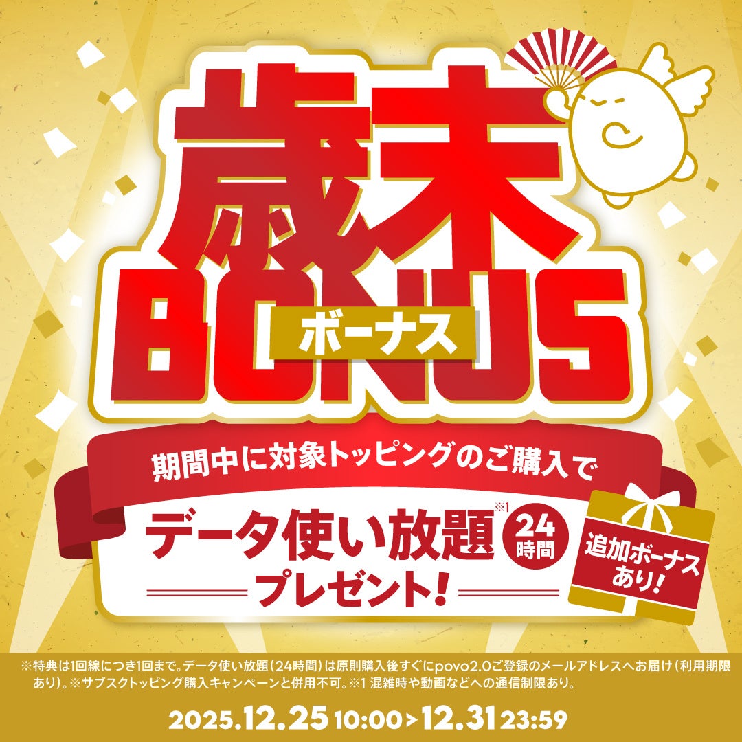 povo、「2025年 歳末祭」対象トッピング購入で「データ使い放題(24時間)」をプレゼント