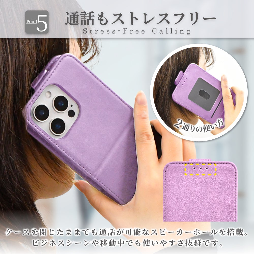 スピーカーホール付きで、カバーを閉じたまま通話可能。フタは裏側に回して持てるので、開いた状態でも邪魔にならず、通話時も困らない。