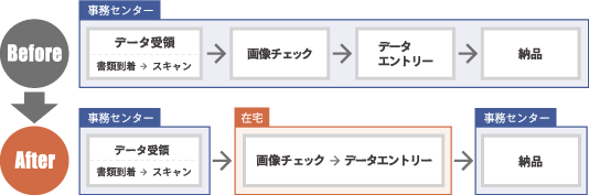 紙を伴う申請・申込等の手続きに係るバックオフィス業務を、センターと在宅を組み合わせたハイブリッド運用で提供します。書類原本の管理やスキャン、個人情報の管理をセンターで行い、画像チェックやデータエントリー、審査業務などを在宅にて行うことにより、繁閑に応じたフレキシブルな対応をスピーディーに行います。また、従来よりもセンターの業務スペースを縮小できるため、固定費を削減することが可能です。