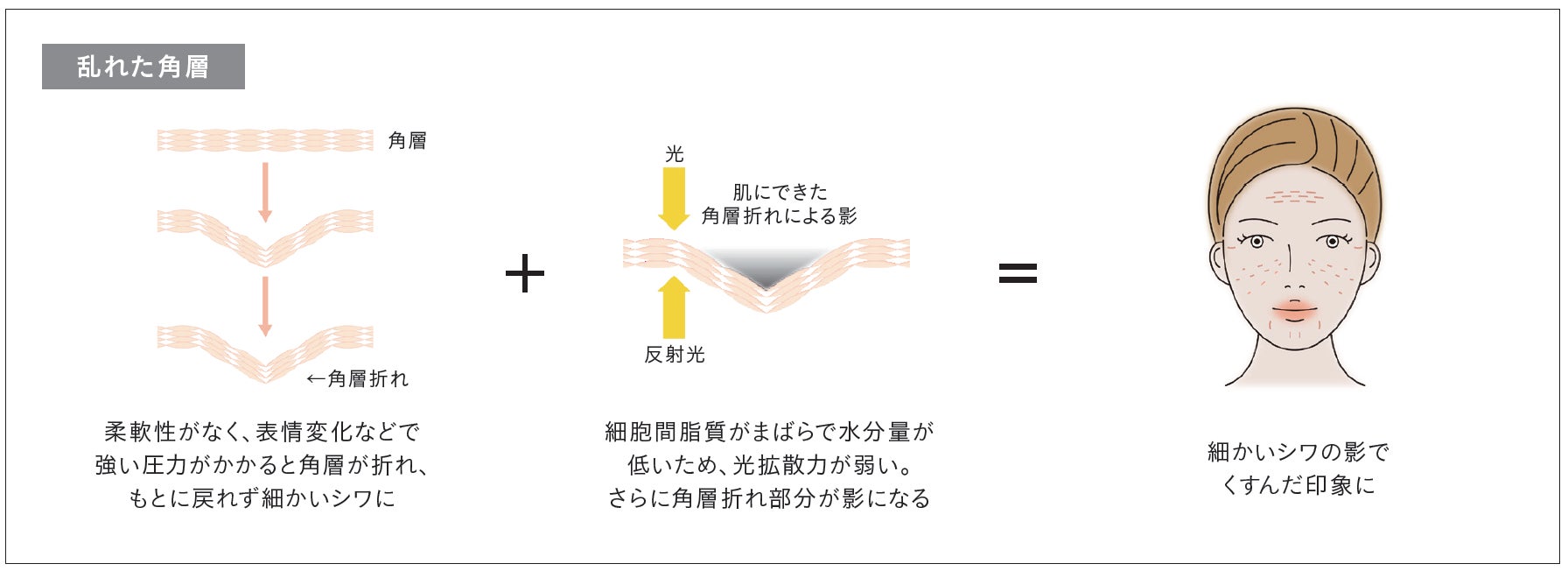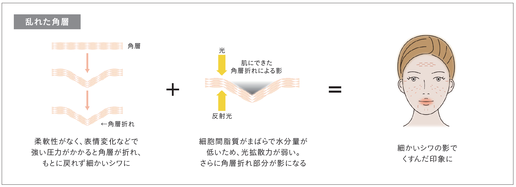 顔を暗くくすませるのは、角層硬化で発生する「角層折れ」による細かいシワの“影”