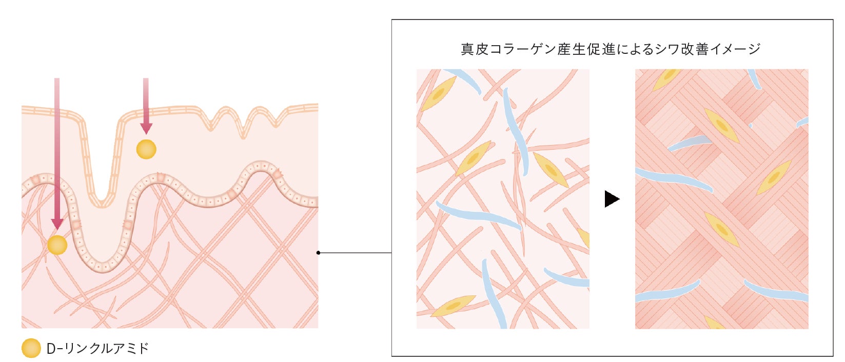 シワ改有効成分D-リンクルアミド※が表皮性・真皮性の両方のシワにアプローチ。真皮コラーゲン産生を促進し、深い影を落とすシワを改善します。
