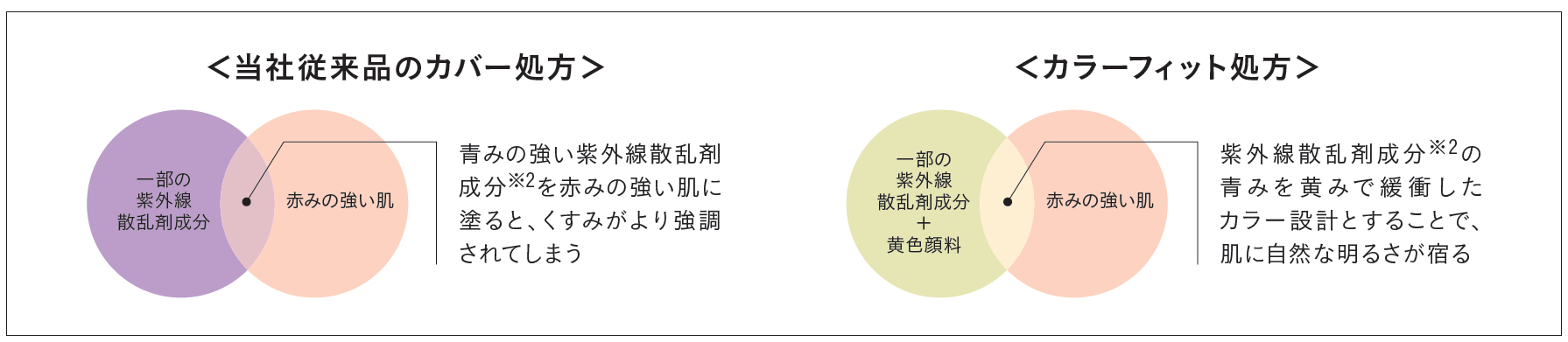 大人女性※1の肌は角層が乱れやすく、「肌の赤み」も起こりやすい状態となります。肌にやさしくUVカット効果を発揮する紫外線散乱剤成分※2は青みがかっており、赤みの強い肌に重ねるとくすんだ色に見えてしまいます。そこで、紫外線散乱剤成分※2特有の青みを補正する独自のカラーブレンドにし、色ムラなどの肌悩みを自然にカバーしながら、くすみのない透明感のある自然な仕上がりを実現する 「カラーフィット処方」を搭載しました。