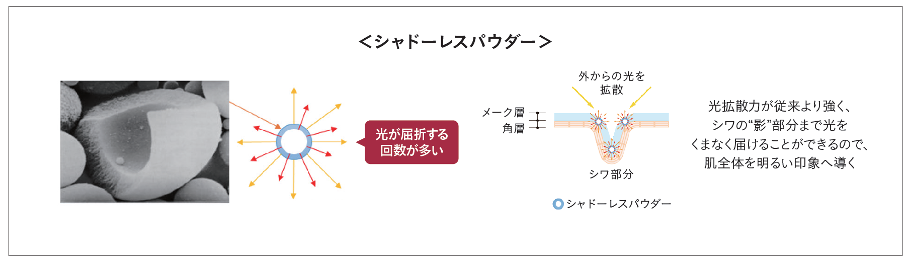 シャドーレスパウダーは、粉体内部を中空状にすることで光の屈折回数が増え、光をより多く拡散させることができます。そのためシワの“影”部分にも、強く光を巡らせることができます。