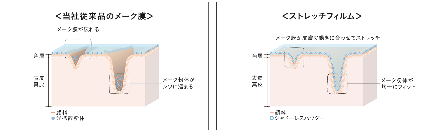 ② 表情変化でシワになりやすい部分も崩れにくい「ストレッチフィルム」