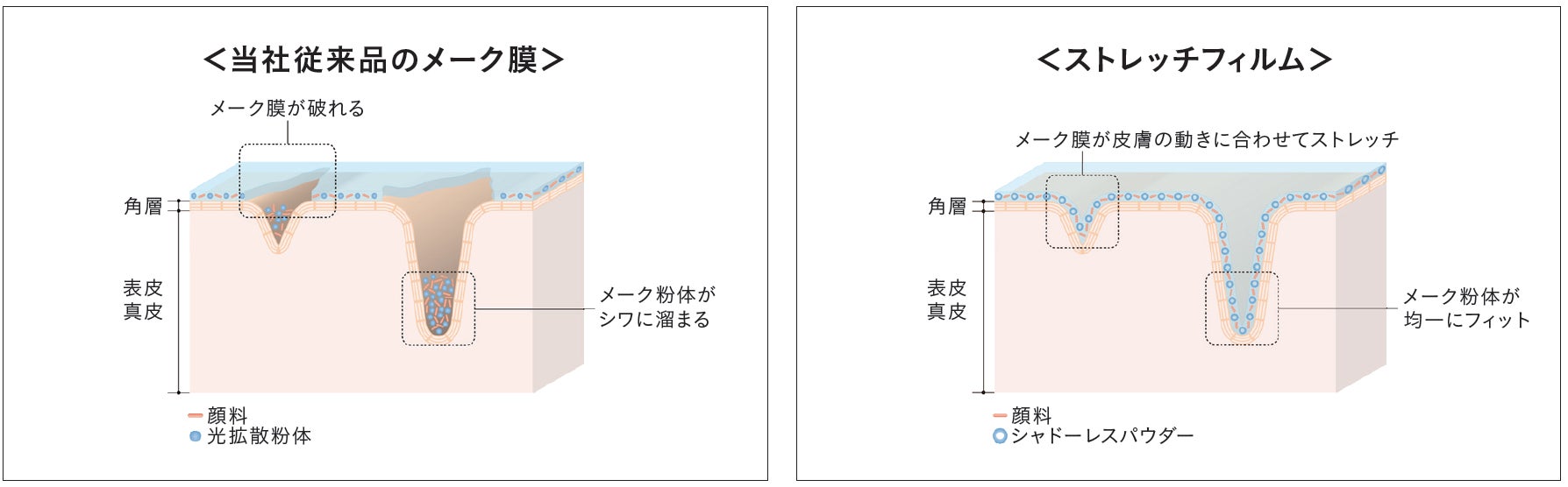 水分を含んだ均一なメーク膜が、表情の変化や皮膚の動きに合わせて自在にストレッチするので、柔軟な角層のように肌表面のしなやかさをサポート。シワになりやすい部分でも崩れにくく、角層折れによって発生したシワの“影”をカバーし続けることができます。