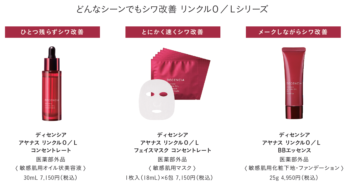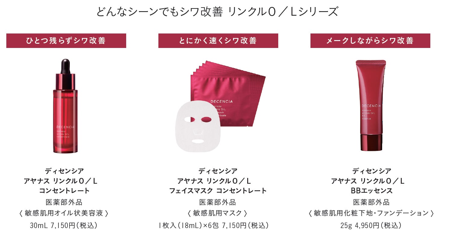 ディセンシアは長年の敏感肌と角層研究の知見から、2019年に全顔用のシワ改善オイル状美容液「リンクルO/L コンセントレート」を、2020年に速攻集中シワケアを叶える「リンクルO/L フェイスマスク コンセントレート」を発売いたしました。