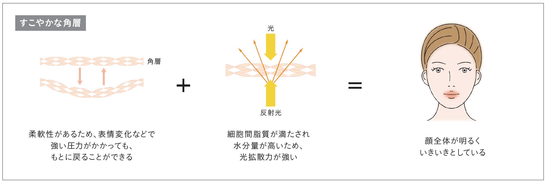 乾燥などによって柔軟性を失い乱れた角層は、細胞間脂質がまばらで水分量が低く十分に光を拡散することができなくなっていました。さらに表情変化などで角層に圧力がかかると、折れ曲がってもとに戻らなくなる「角層折れ」が発生。細かいシワとなり、顔全体に暗い影を生み出していることがわかりました。