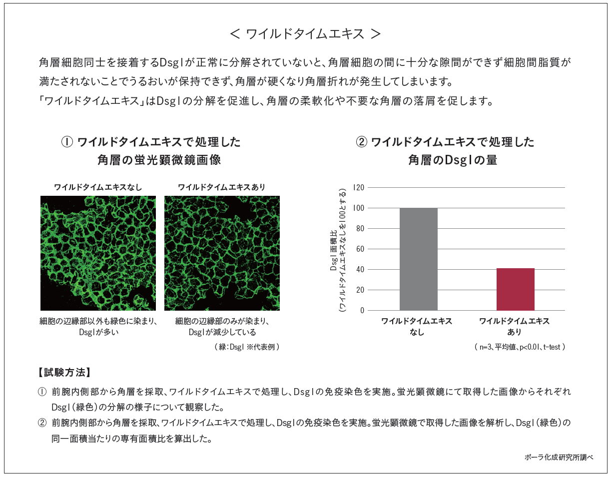 今回さらに、角層の柔軟性向上と生まれ変わりを促進することを目的として、角層接着因子「デスモグレイン1(以下、Dsg1)」の分解促進に着目したところ、「ワイルドタイムエキス」にDsg1分解促進作用があることが確認されました。