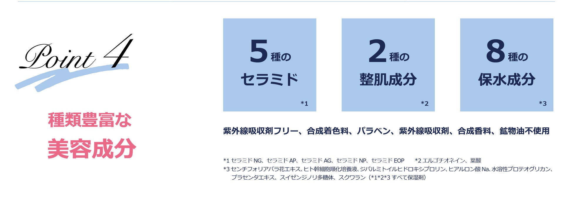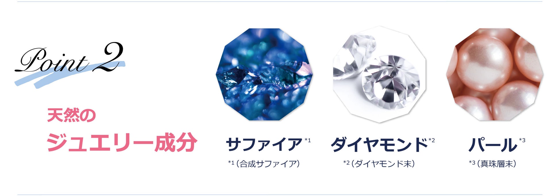 *1光沢剤:天然サファイアパウダー(合成サファイア)、天然ダイヤモンドパウダー(ダイヤモンド末)、天然パールパウダー(真珠層末) 、天然シルクパウダー(シルク) *2メイクアップ効果の耐水性