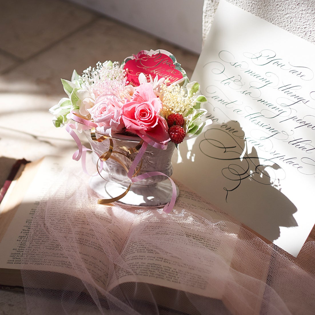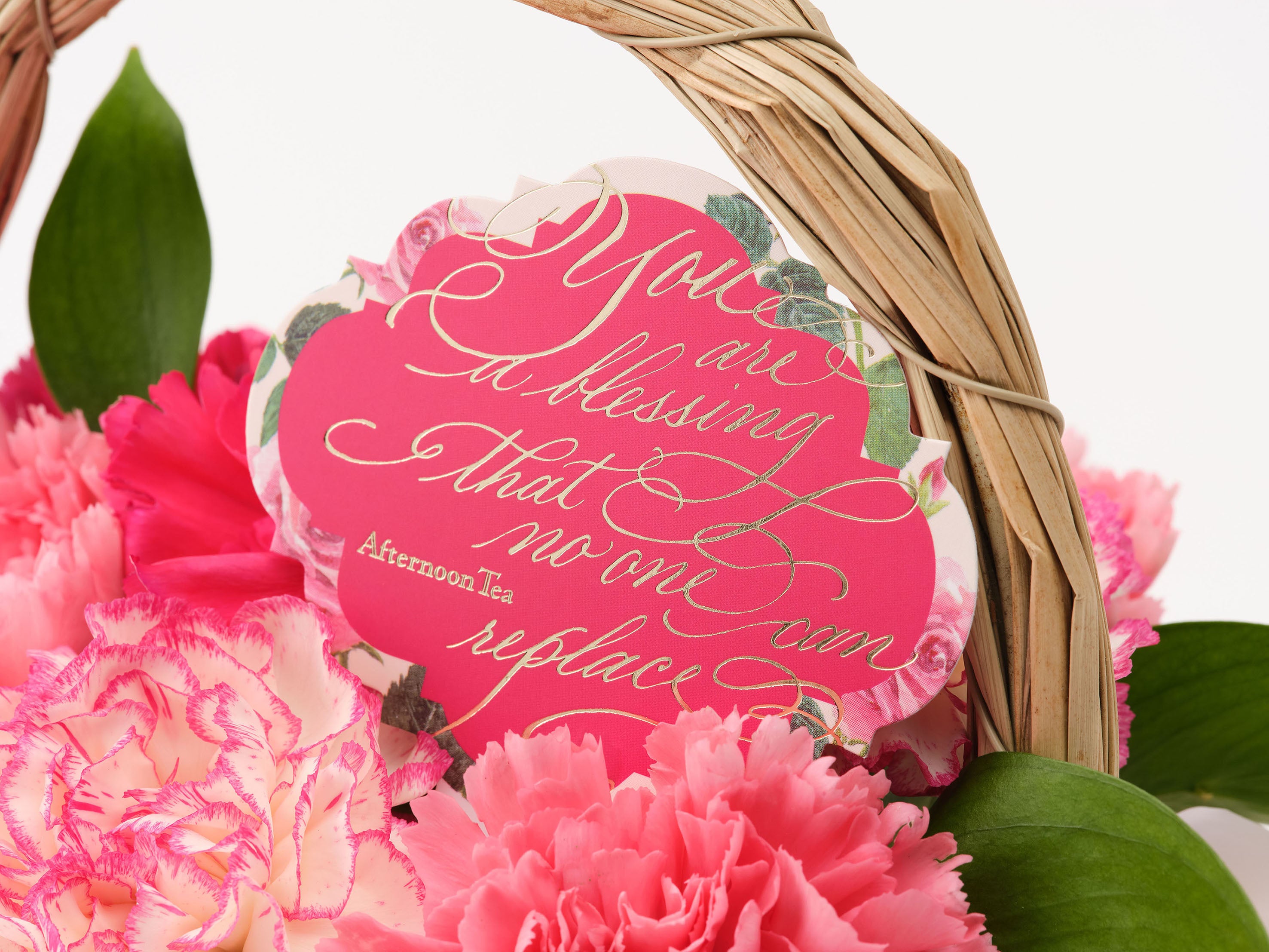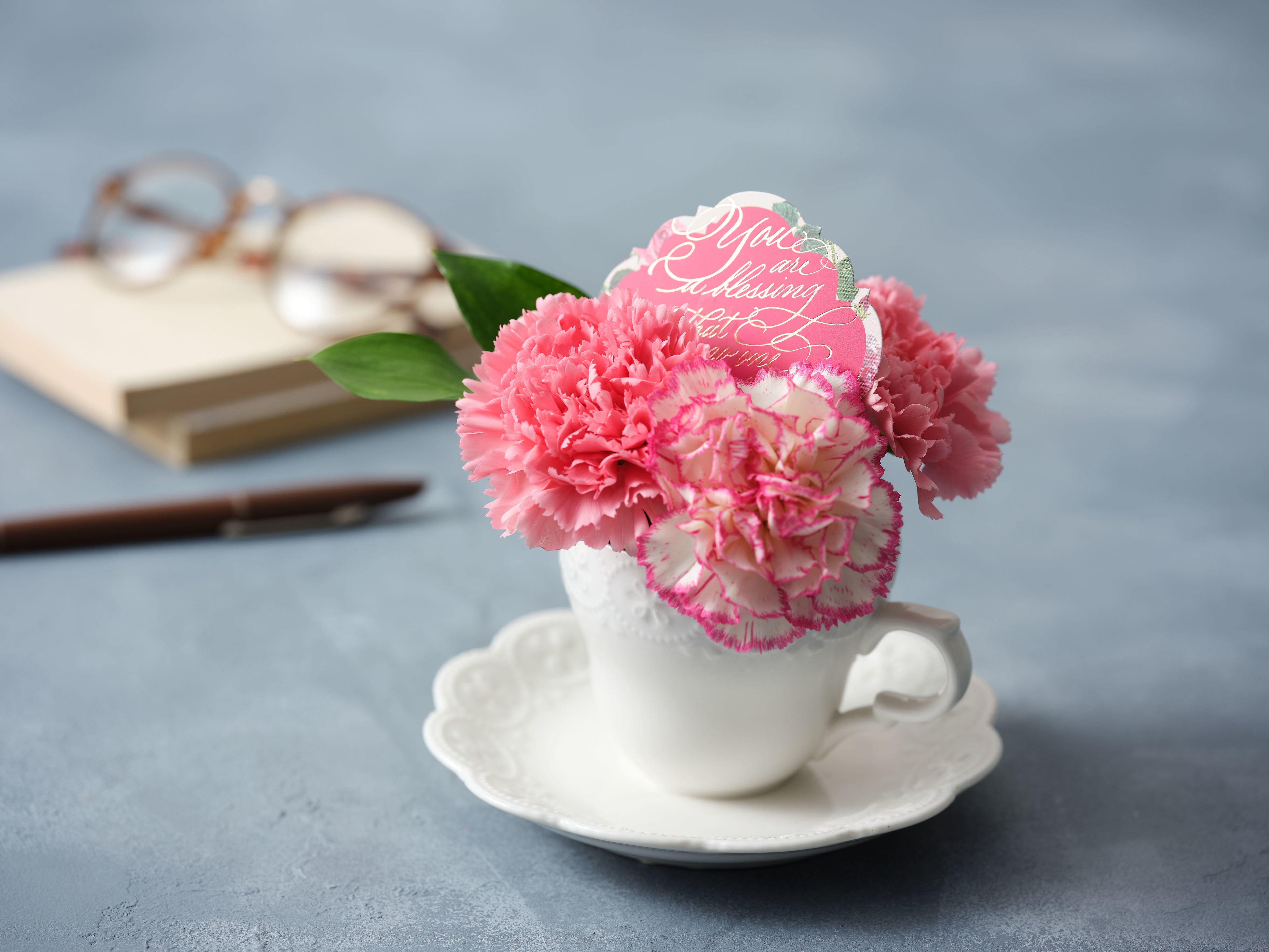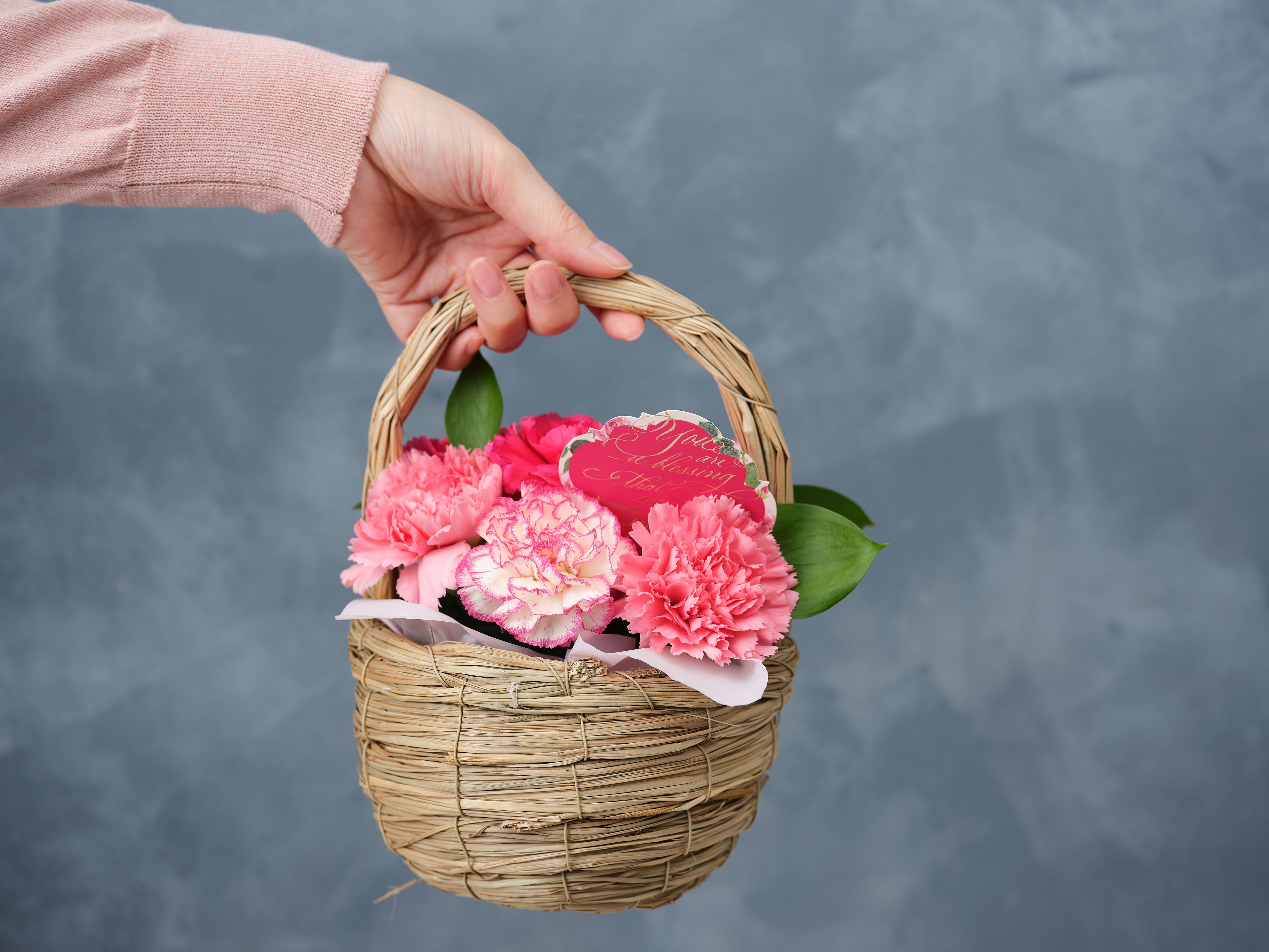 ティーカップや見た目も可愛いバスケットタイプの、母の日らしいアレンジメントが登場しました。ピンクのカーネーションにカリグラフィーのメッセージカード付きで、お花好きなお母さんにオススメです。