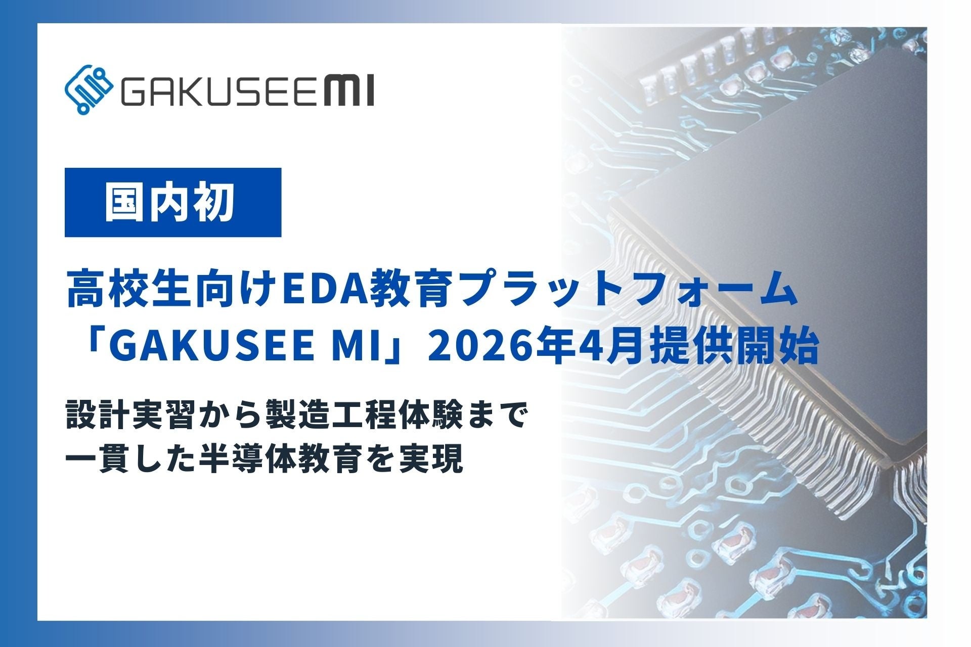 こうした状況を受け、当社は高校段階から実践的な半導体教育を提供する教育プラットフォーム「GAKUSEE MI」を開発しました。今春から本格的に開始される文部科学省の「N-E.X.T.(ネクスト)ハイスクール構想」における半導体教育ニーズに対応するため、2026年4月の正式リリースを決定しました。