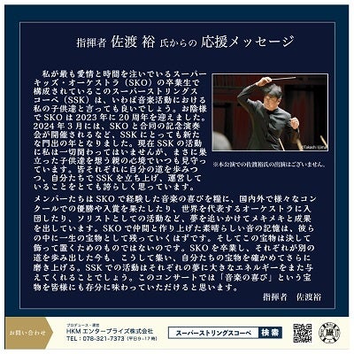 私が最も愛情と時間を注いでいるスーパーキッズ・オーケストラ(SKO)の卒業生で構成されているこのスーパーストリングスコーベ(SSK)は、いわば音楽活動における私の子供達と言っても良いでしょう。お陰様でSKOは2023年に20周年を迎えました。2024年3月には、SKOと合同の記念演奏会が開催されるなど、SSKにとっても新たな門出の年となりました。現在SSKの活動に私は一切関わってはいませんが、まさに巣立った子供達を想う親の心境でいつも見守っています。皆それぞれに自分の道を歩みつつ、自分たちでSSKを立ち上げ、運営していることをとても誇らしく思っています。